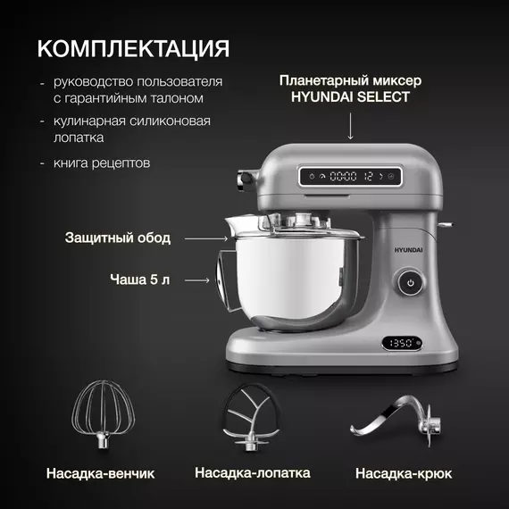 | Комплектация | Миксер; чаша; защитная крышка; насадка-венчик; насадка-лопатка с гибким ребром; насадка-крюк; кулинарная силиконовая лопатка; книга рецептов; инструкция с гарантийным талоном |