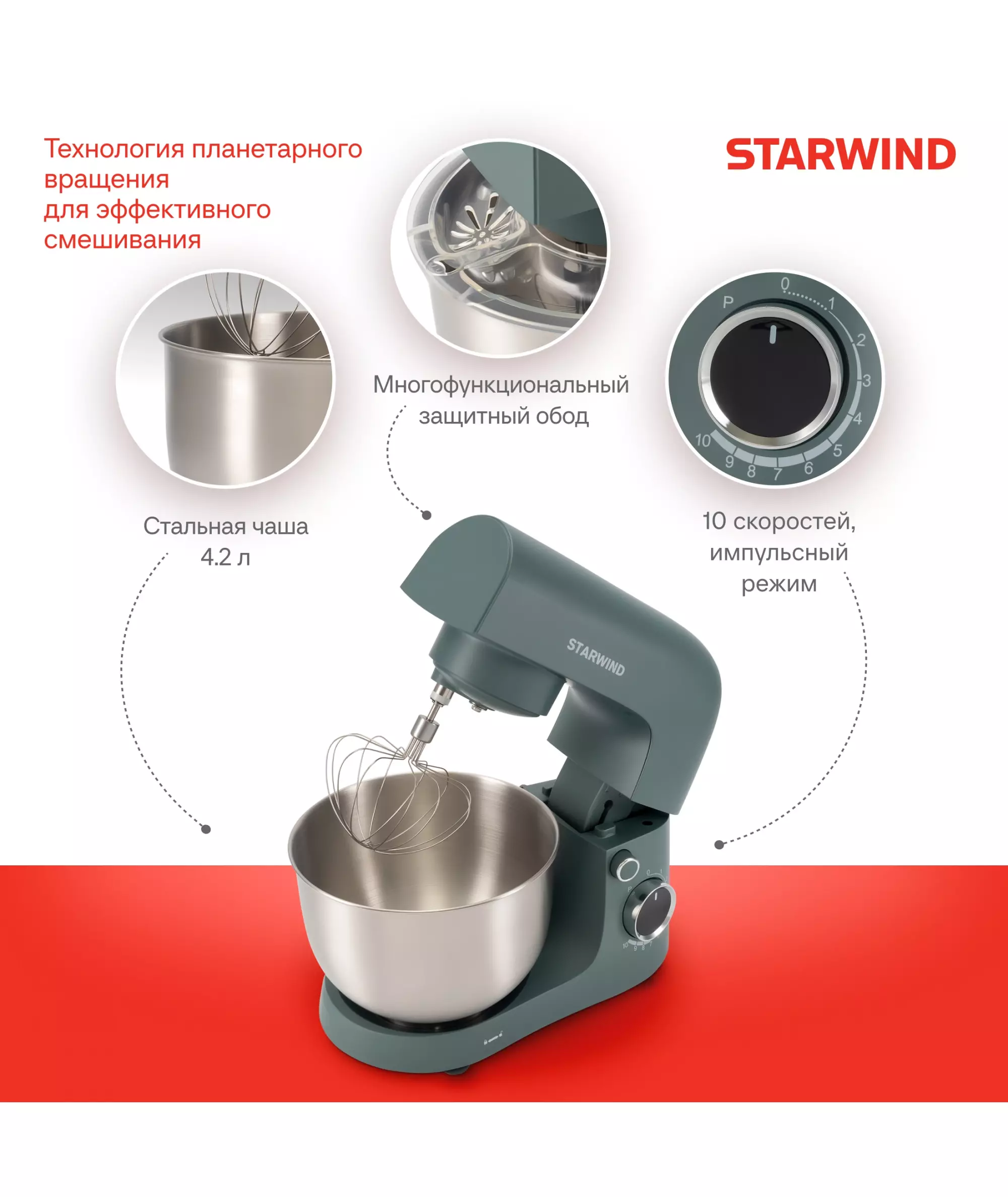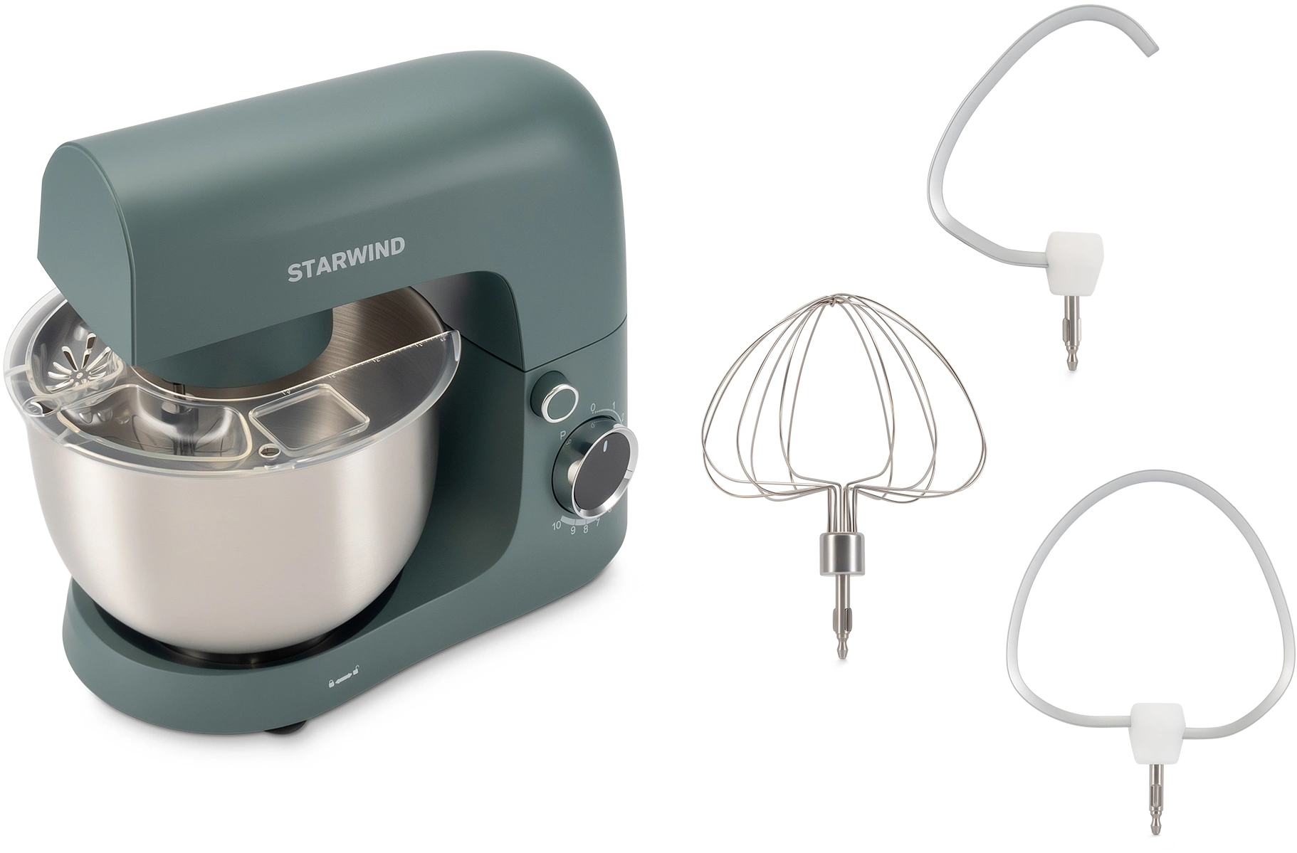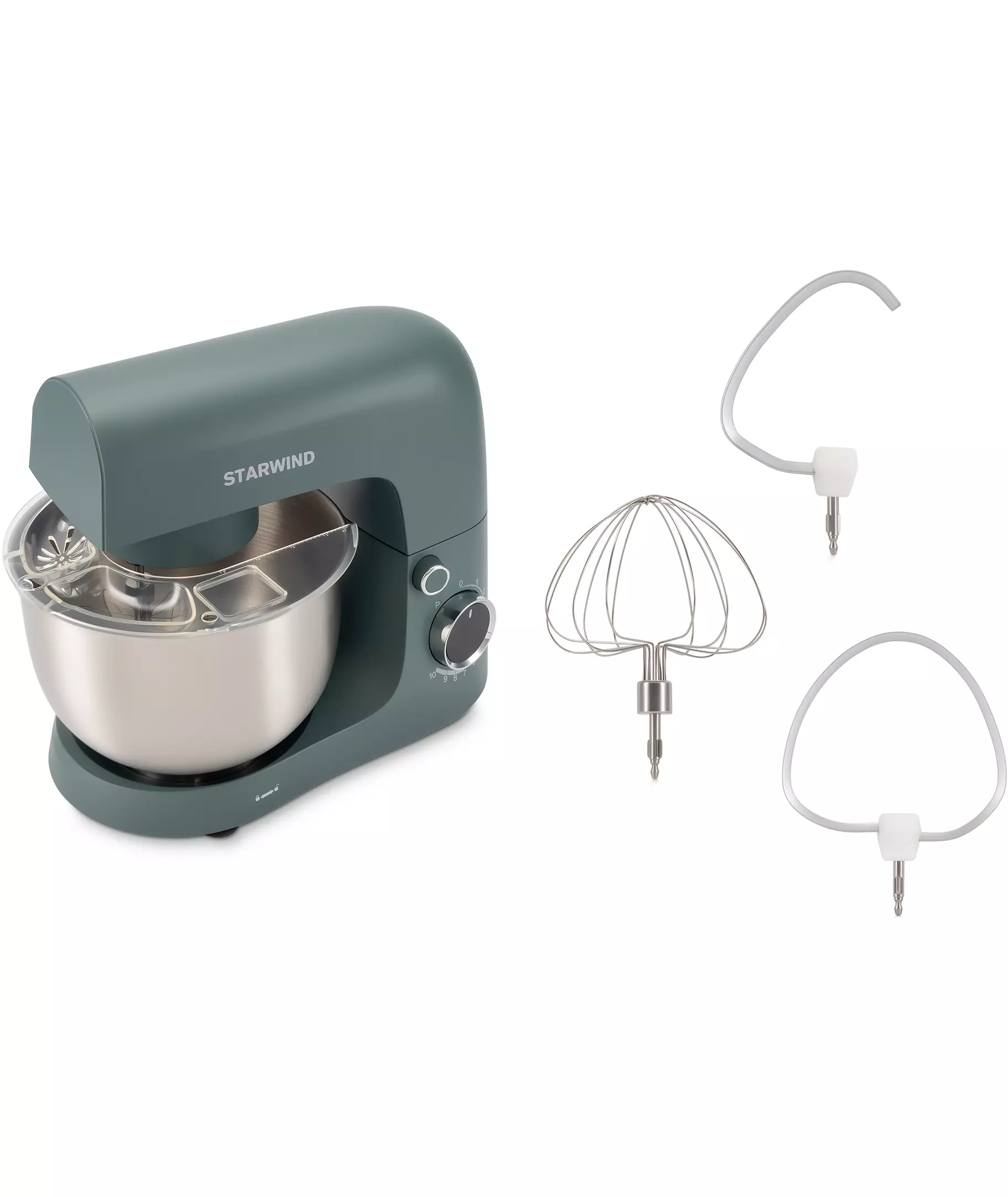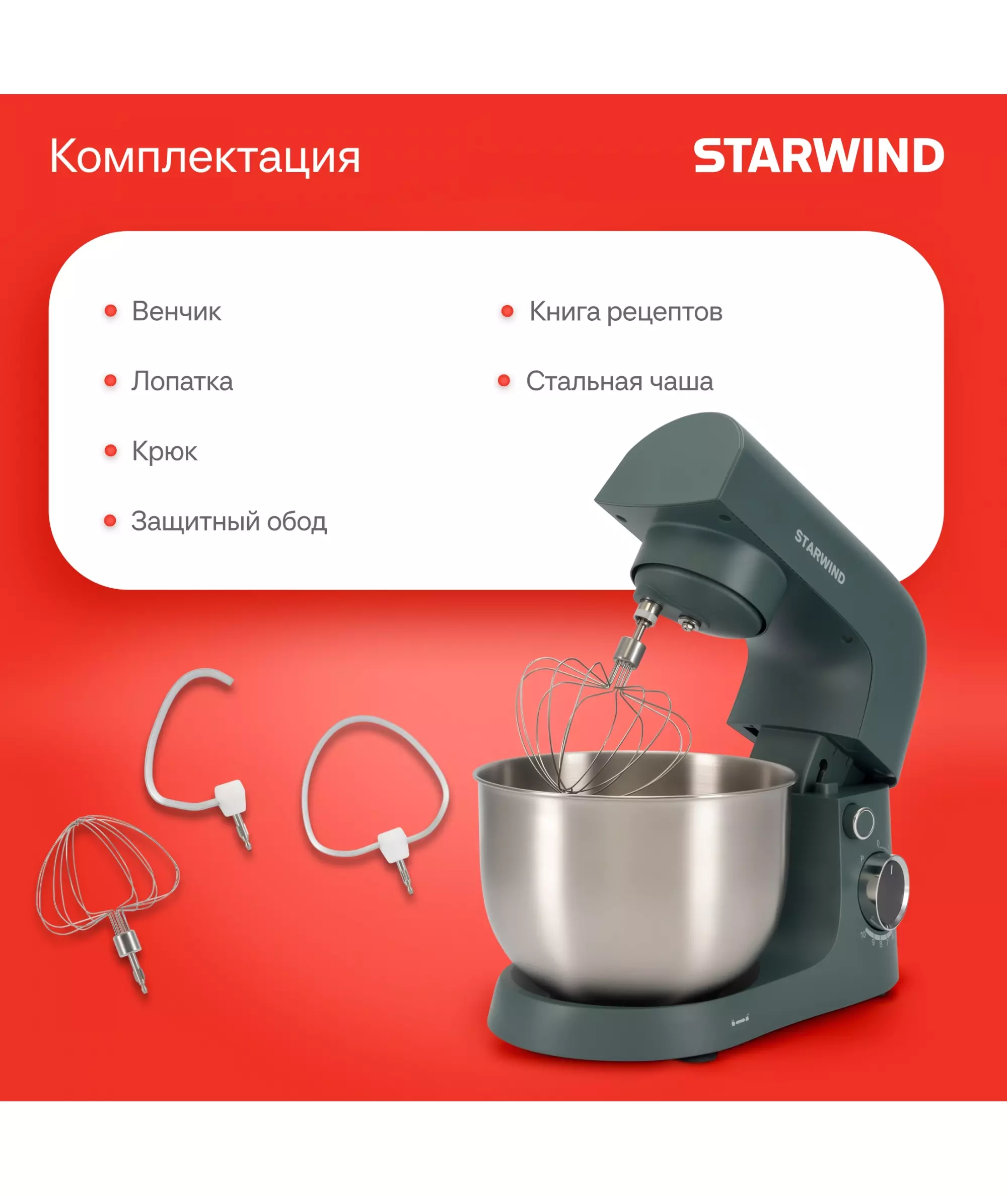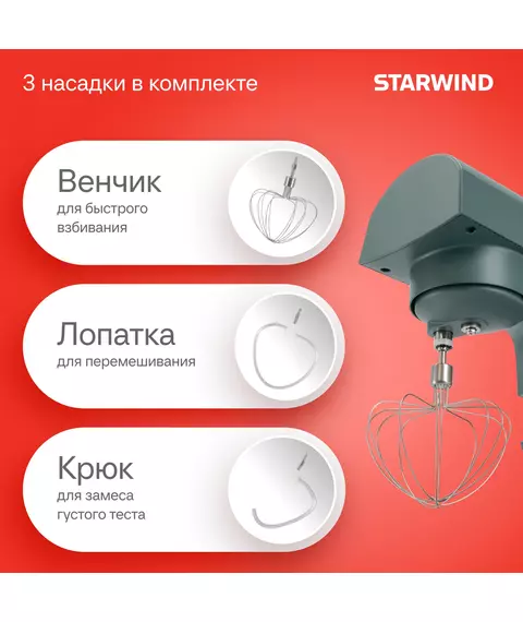 | Комплектация | Миксер; насадка-крюк; насадка-венчик; насадка-лопатка; инструкция с гарантийным талоном; книга рецептов; мультифункциональный защитный обод |