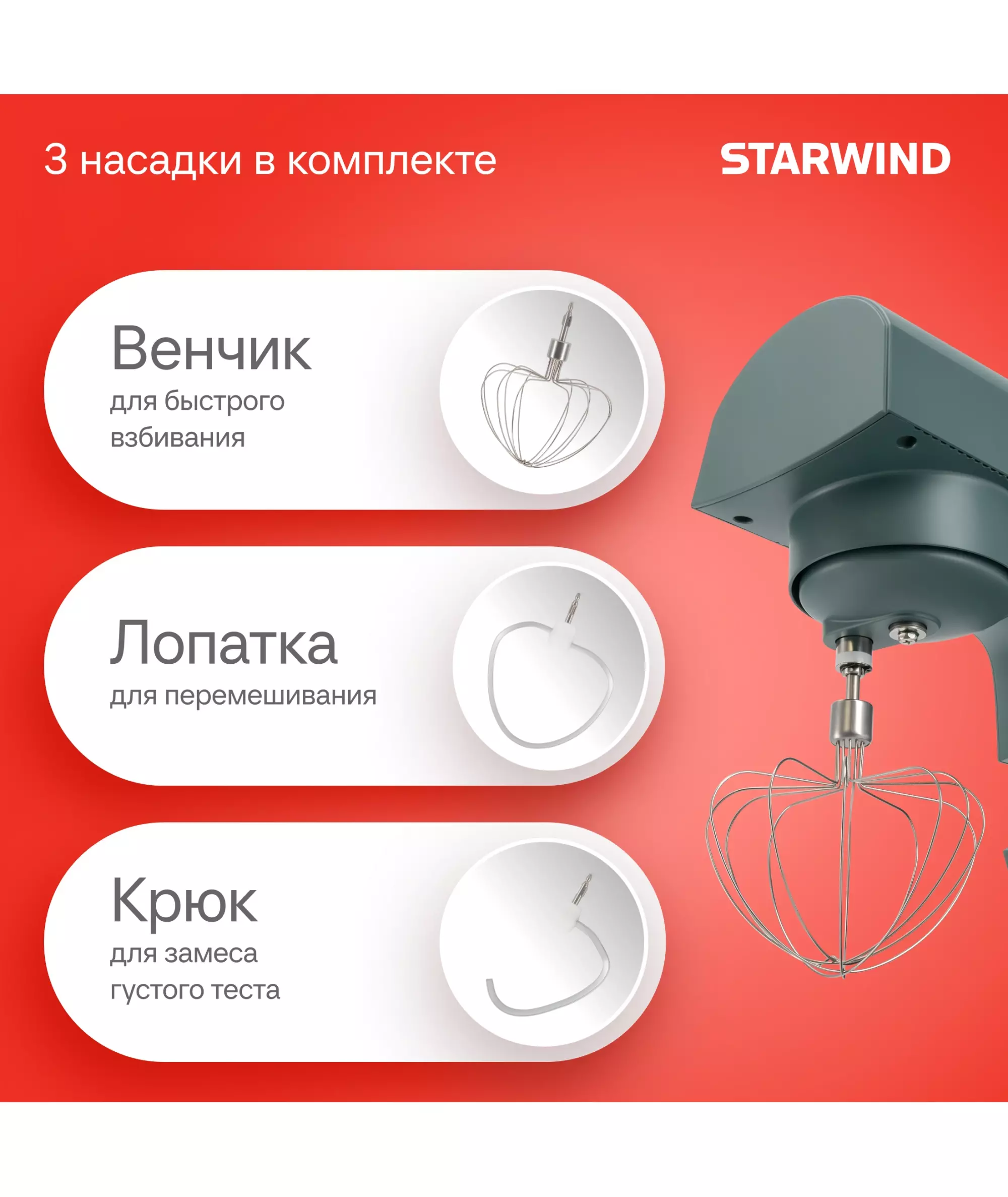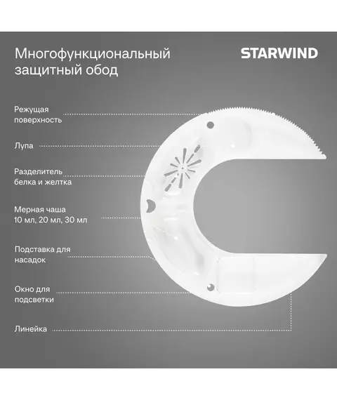 | Особенности | Мультифункциональный обод: режущая поверхность + разделитель белка и желтка + ёмкость для добавления ингредиентов + отверстие для хранения насадок + подставка под фонарик + линейка |