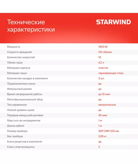 | Особенности | Мультифункциональный обод: режущая поверхность + разделитель белка и желтка + ёмкость для добавления ингредиентов + отверстие для хранения насадок + подставка под фонарик + линейка |