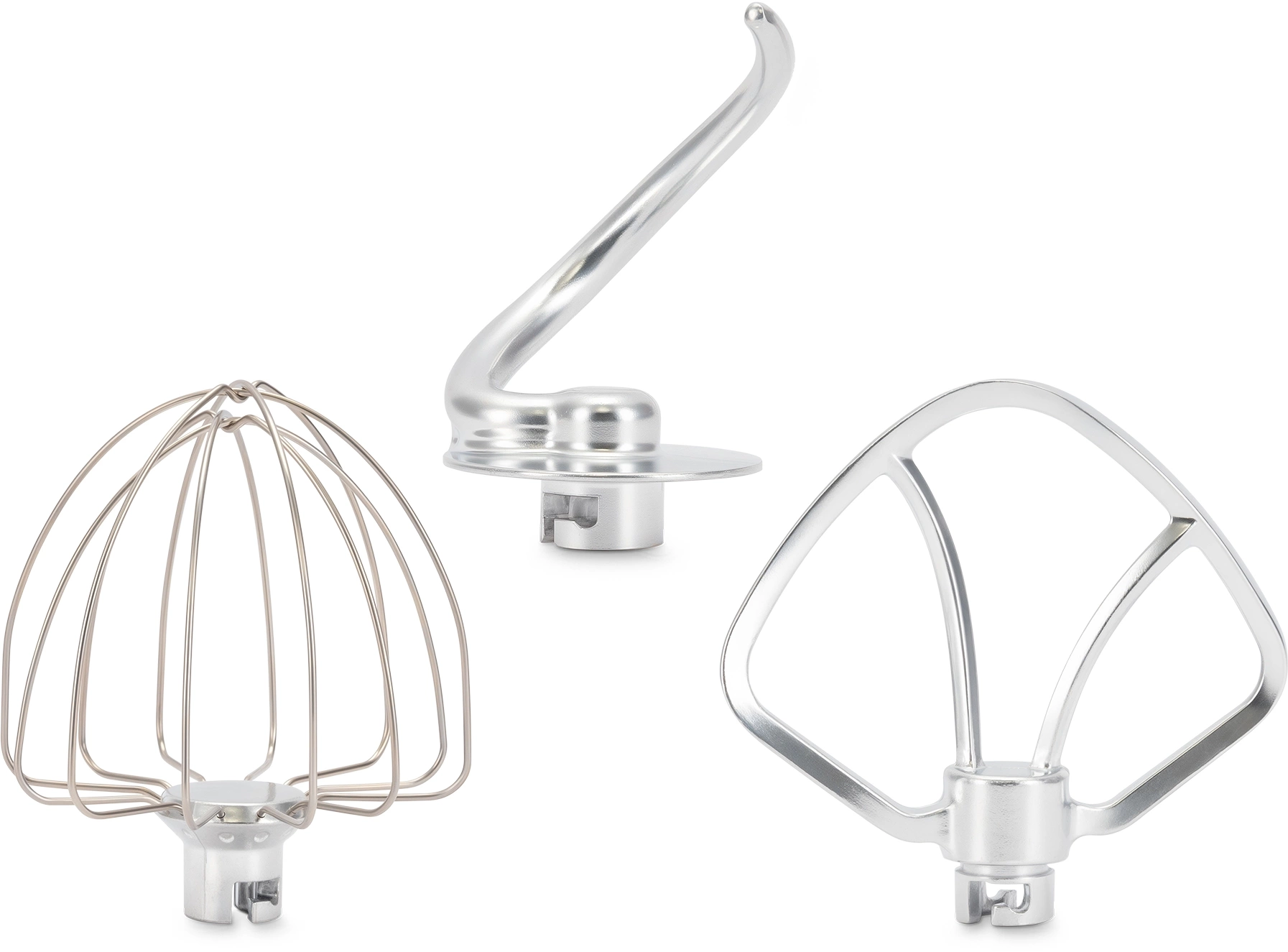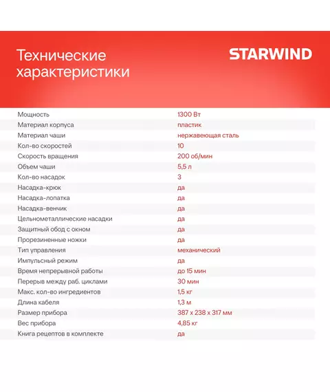 | Комплектация | Миксер; чаша; защитная крышка для чаши; насадка-венчик; насадка-лопатка; насадка-крюк; руководство пользователя с гарантийным талоном; книга рецептов |