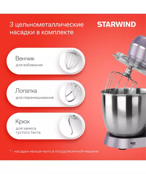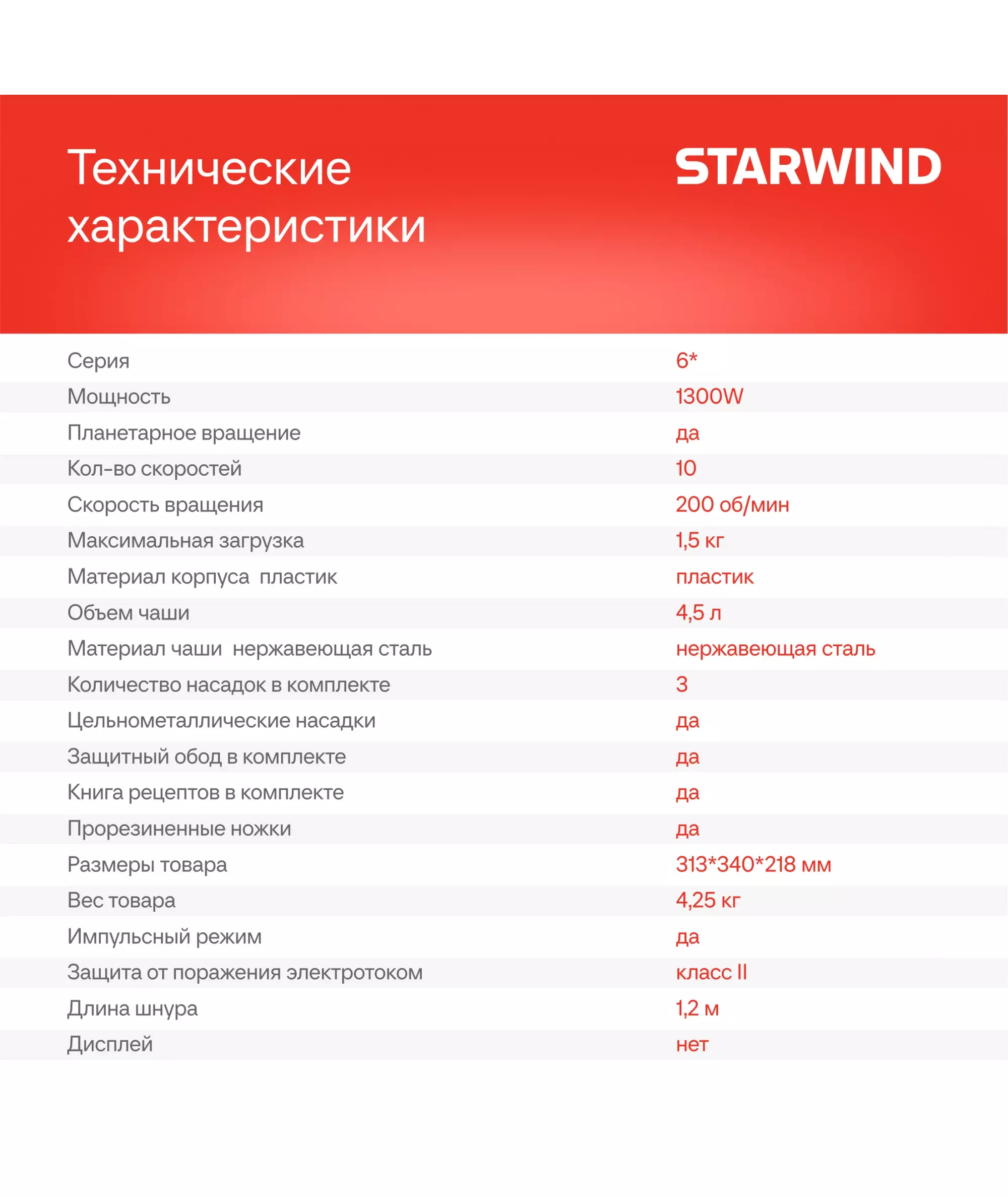 | Комплектация | миксер; чаша; защитная крышка для чаши; насадка-венчик; насадка-крюк; насадка-лопатка; книга рецептов; инструкция с гарантийным талоном |