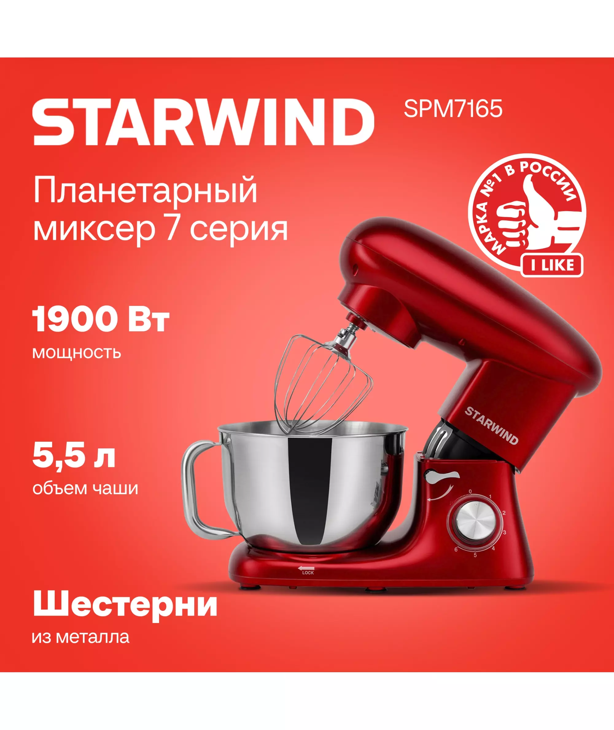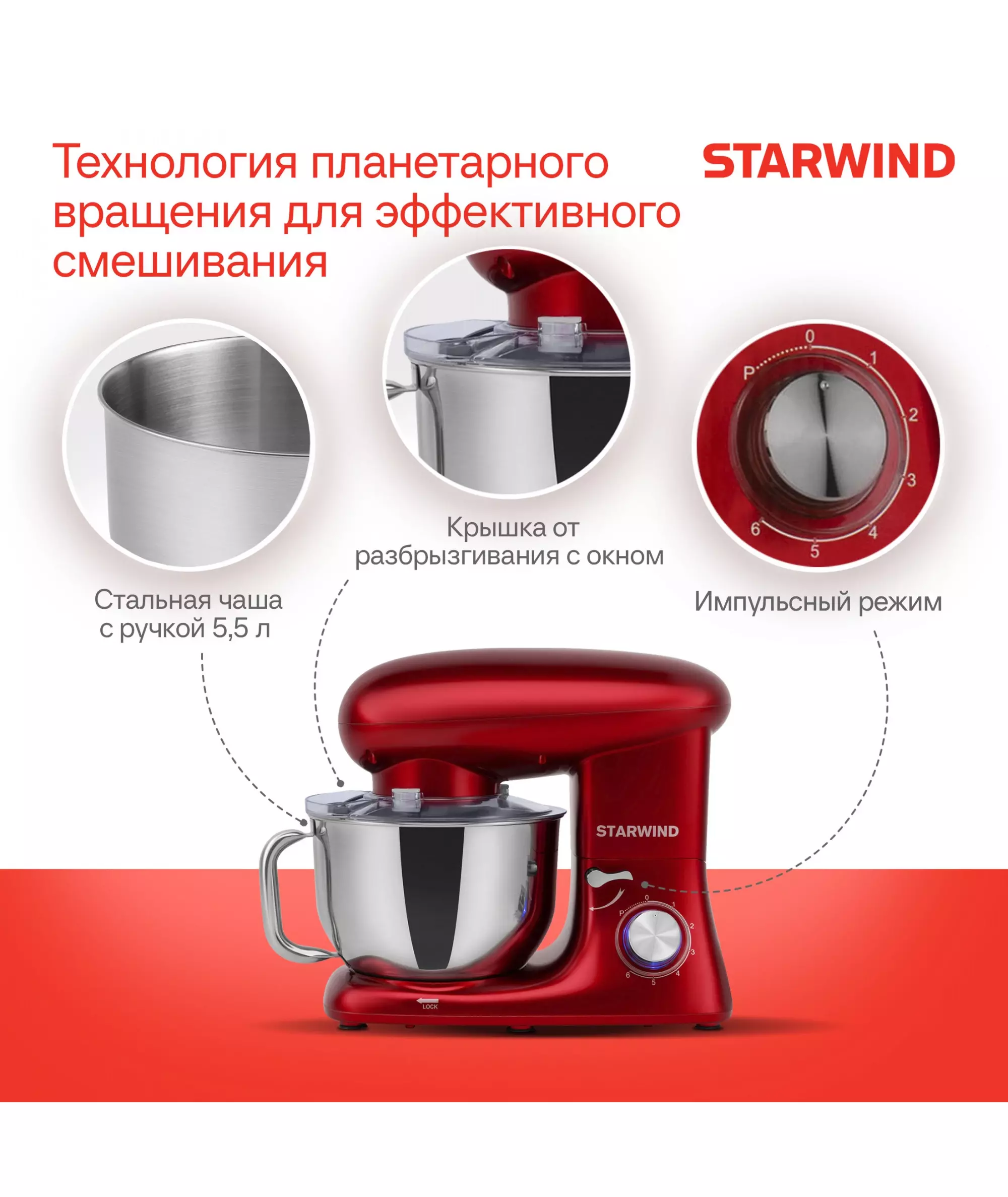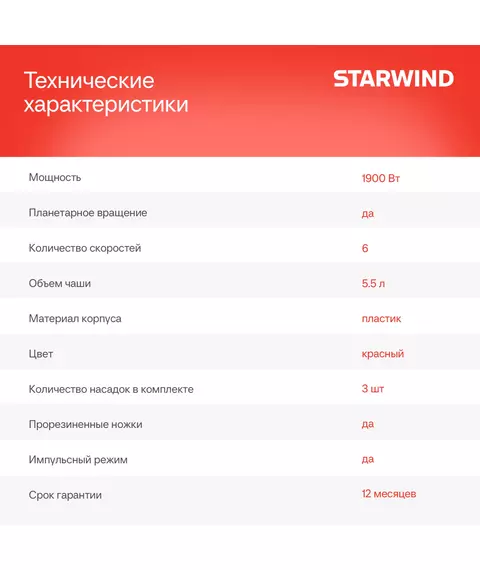 Миксер планетарный STARWIND SPM7165 1900Вт красный