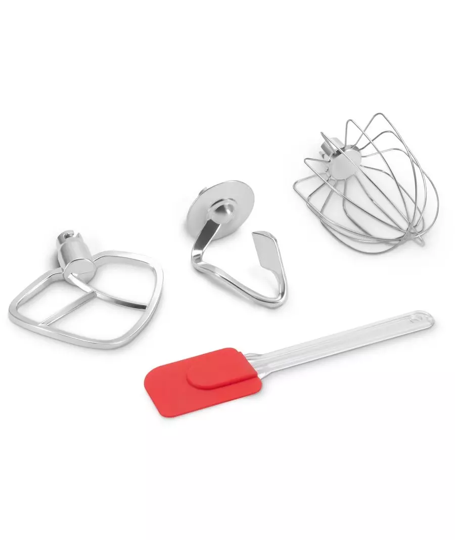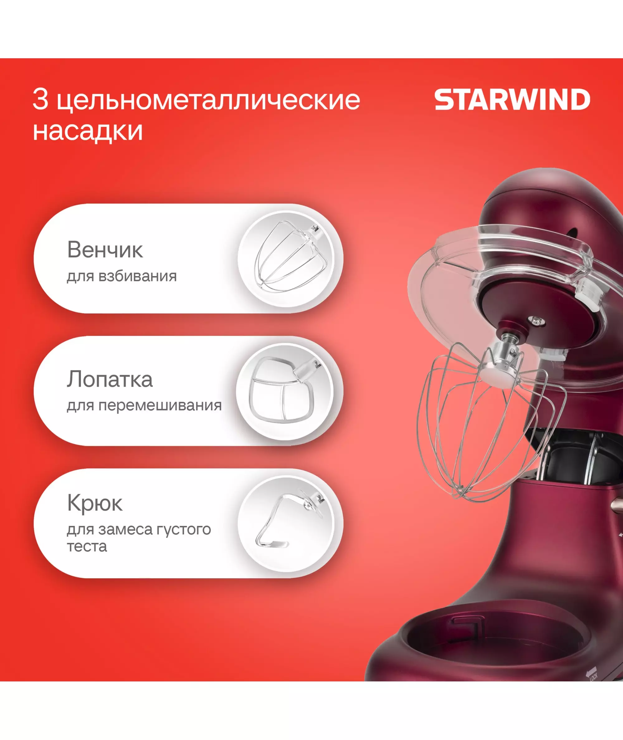 Цельнометаллические насадки: Миксер комплектуется тремя самыми популярными насадками — венчиком для взбивания, лопаткой для мягких смесей и крюком для теста, выполненными из цельного металла, что гарантирует их долгую службу. В комплекте также идут защитная крышка с окном для добавления ингредиентов и кулинарная лопатка, которая позволит легко собрать крем или тесто со стенок чаши.