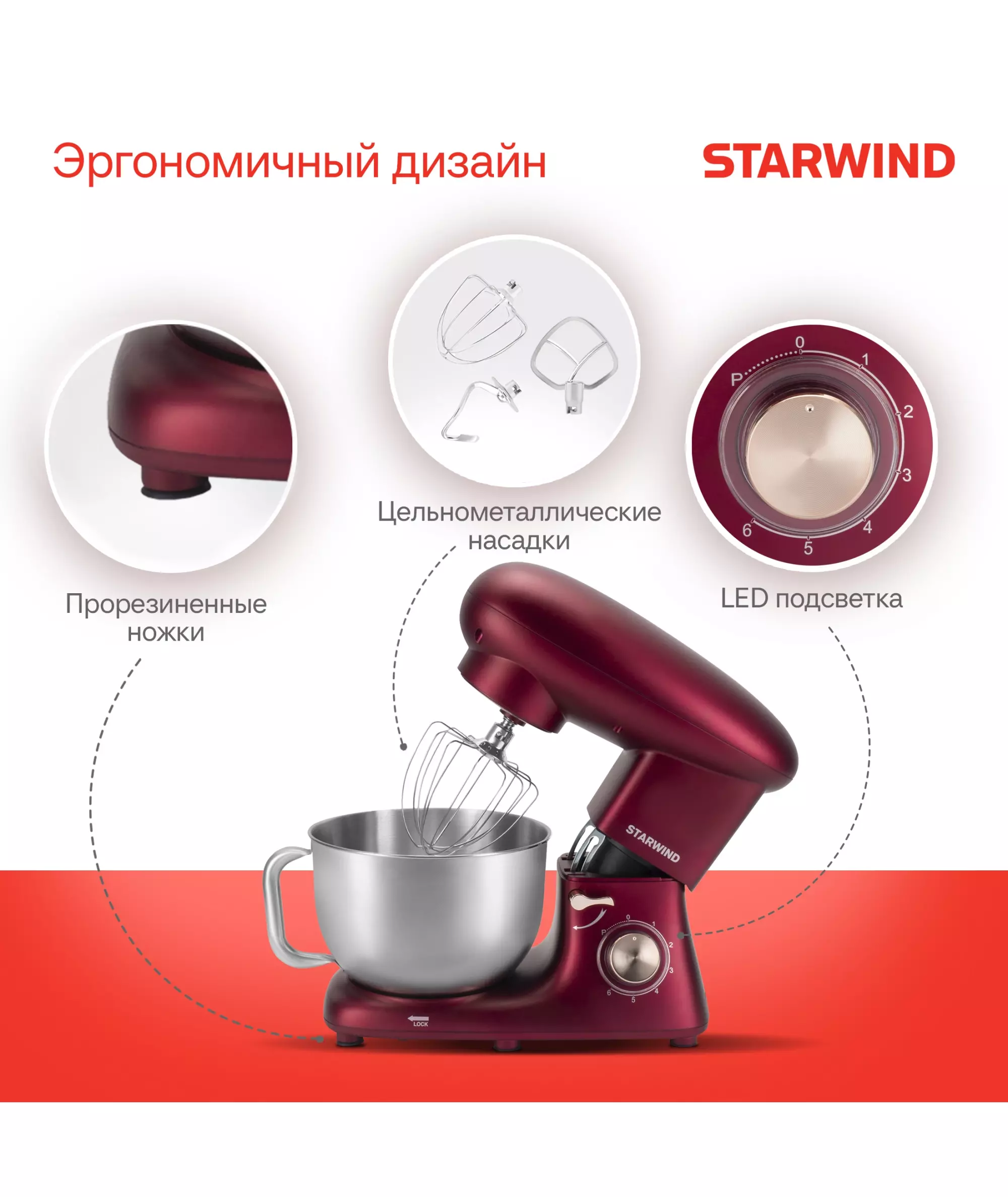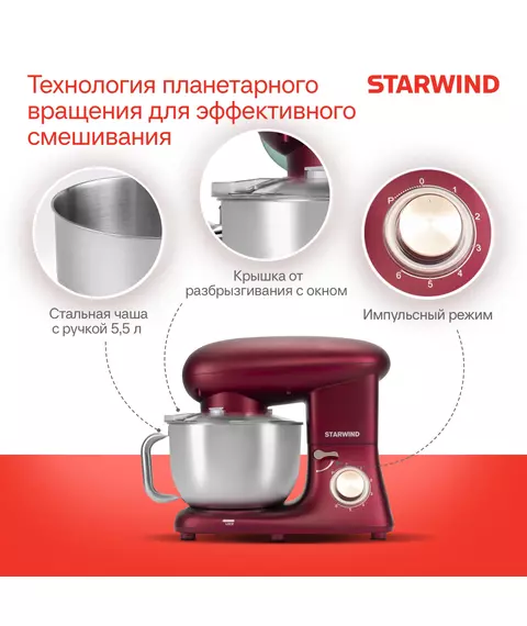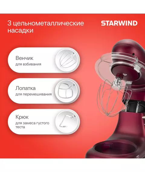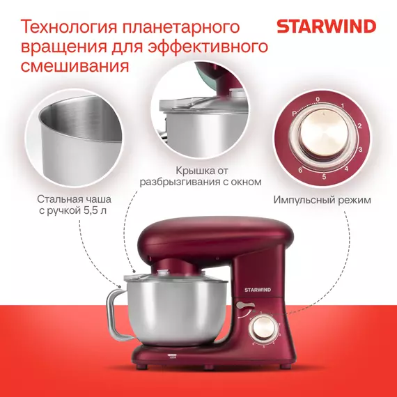 Планетарный миксер Starwind SPM7170 в насыщенном гранатовом цвете — это элегантный и роскошный прибор, который станет выразительным акцентом в интерьере вашей кухни. Идеально подойдет для тех, кто ценит стиль и индивидуальность.