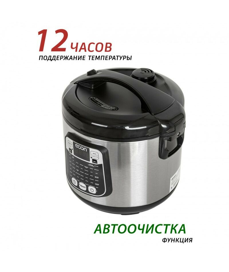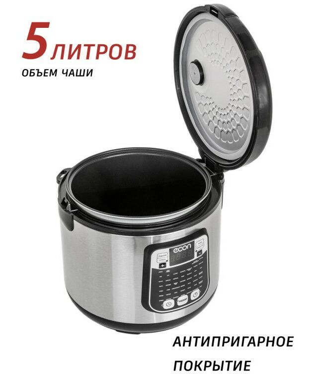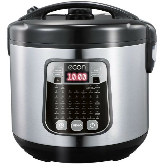 Многофункциональная мультиварка Econ ECO-53MC с электронным управлением и ярким LED дисплеем имеет 45 программ автоприготовления: мой рецепт, жарка, быстрое приготовление, разогрев, рис, суп, на пару, томление, молочная каша, тушение, запекание, йогурт, выпечка, овсянка, плов, сосиски, соте, хлеб, паста, холодец, творог/сыр, глинтвейн, пельмени, пицца, детское питание, отвар, стейк, стерилизация, варенье, крупа, буженина, компот, овощи, настой, соус, бисквит, гречка, суфле, топленое молоко, бульон, корочка, экспресс, оладьи, бурый рис, морепродукты, бобы, подогрев. Помимо этого, вы сможете использовать мультиварку для расстойки теста, приготовления фондю, стерилизации и пастеризации продуктов