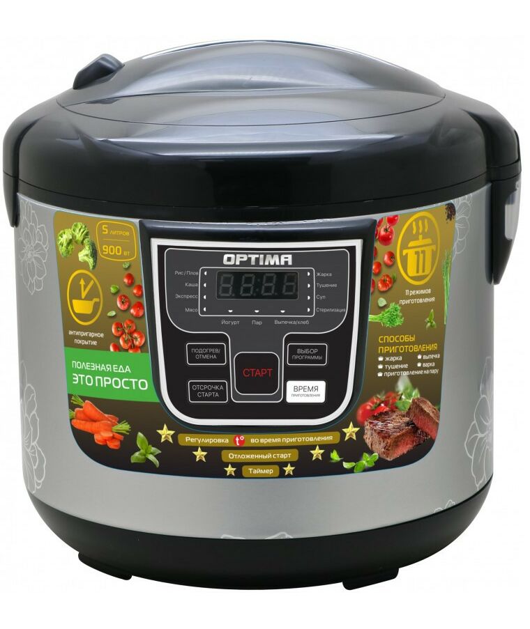 - Мультиварка OPTIMA MC-5101 - примечательна наличием 11 режимов приготовления блюд, стильным внешним видом, корпусом из нержавеющей стали и экологичного черного пластика, наличием прозрачной крышки для визуального контроля, а приготовлением пищи. В комплекте к мультиварки: идет внутренняя чаша, корзина для варки на пару, мерный стакан, лопатка для помешиваний