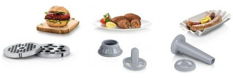 - Насадки насадки-терки; для шинкования; для приготовления колбас; для кеббе