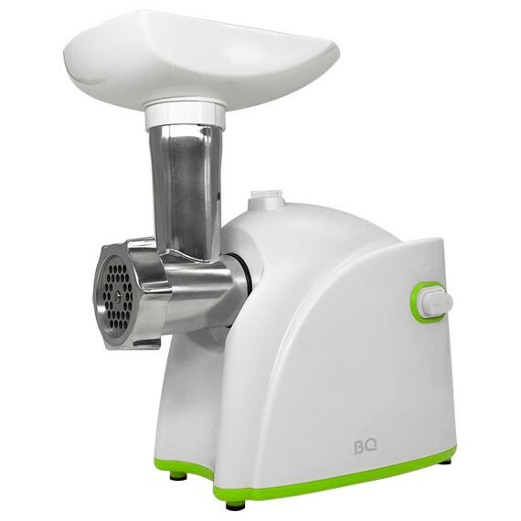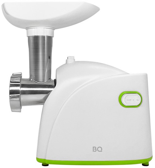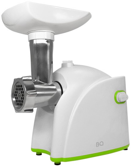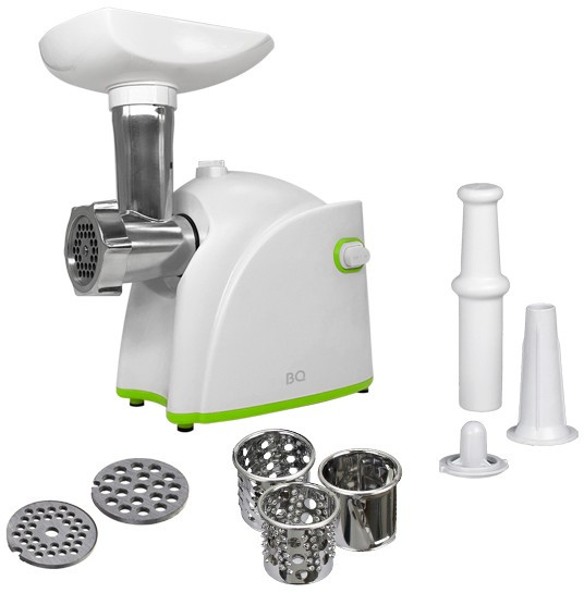 - Блок мясорубки, загрузочный лоток, нож мясорубки, толкатель, шнек мясорубки, фиксирующее кольцо, насадка кебе, насадка для колбасок, насадки овощерезки 3 шт., руководство по эксплуатации, гарантийный талон