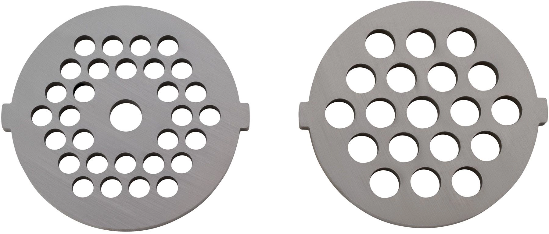 Диски для фарша с отверстиями диаметром 5 и 7 мм позволяют регулировать величину помола, что дает возможность готовить блюда с рубленым мясом.