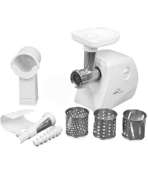 Мясорубка, перфорированный диск, 2 насадки-терки, насадка для шинковки, шнековая соковыжималка, руководство по эксплуатации, упаковка.