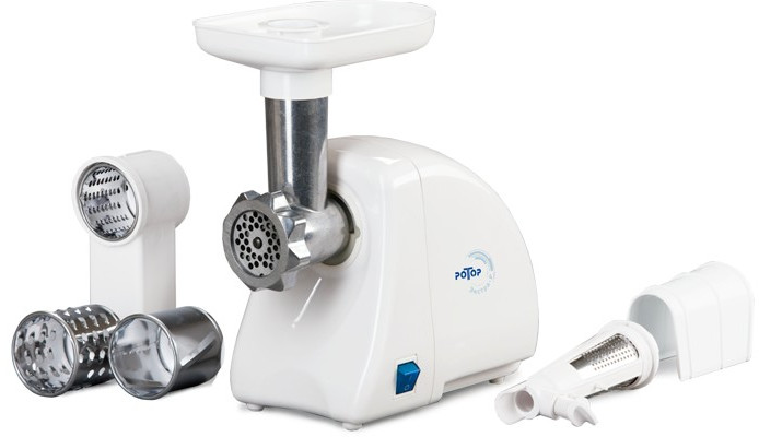- Тип мясорубки — шнековый, возможна комплектация разнообразными насадками (для получения сока, для резки и шинковки овощей, терка). Данная модель снабжена функцией "реверс": для предотвращения уплотнения продуктов внутри мясорубки предусмотрен режим обратного вращения шнека