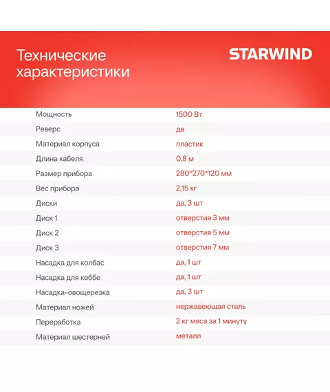 Мясорубка STARWIND SMG3225 1500Вт красный