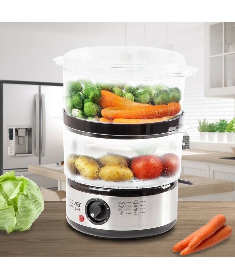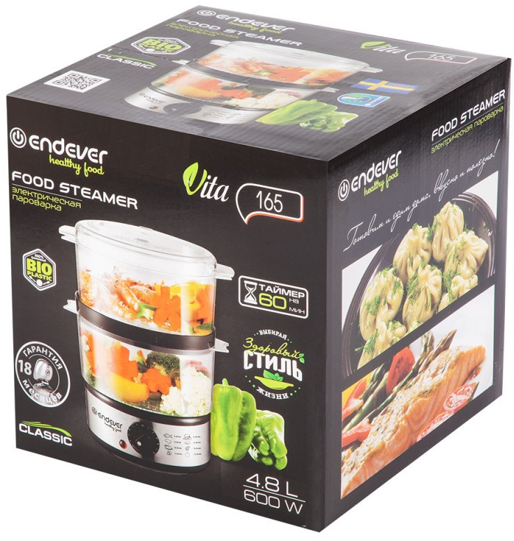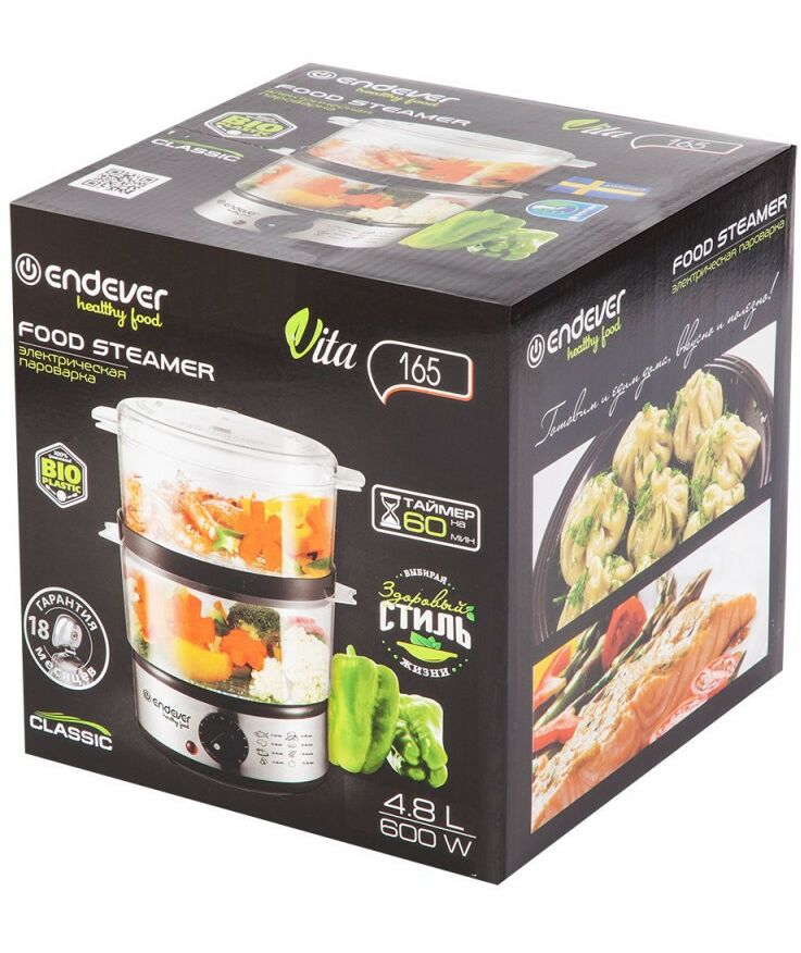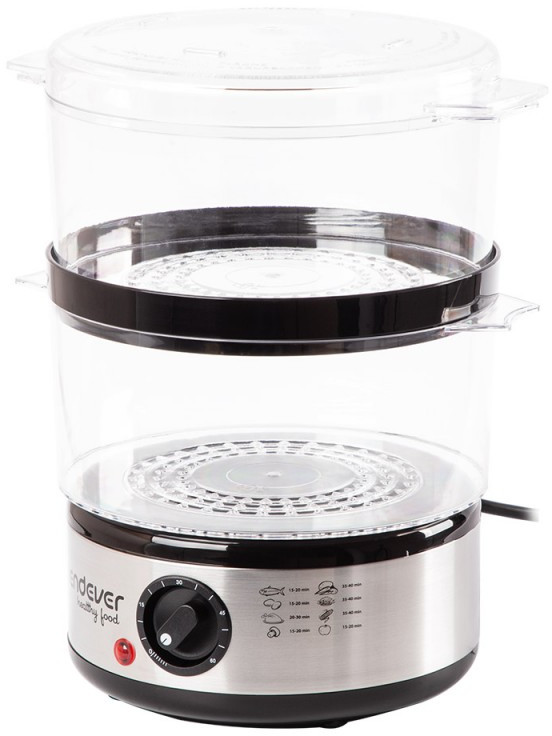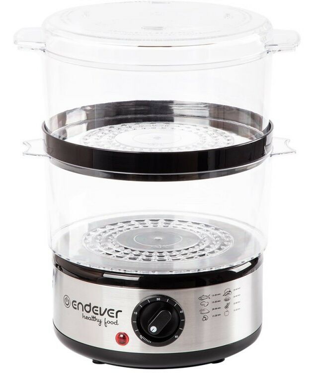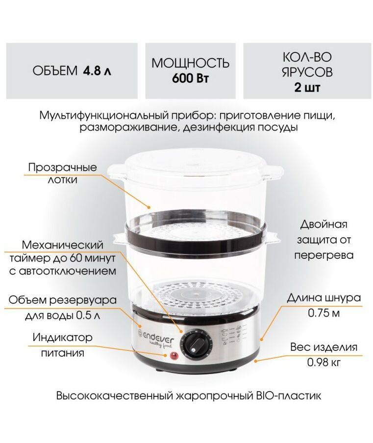 Модель оснащена двумя кастрюлями для приготовления емкостью 2,4 литра каждая, устанавливаемые одна на другую двумя ярусами. Кастрюли выполнены из высококачественного жаропрочного BIO-пластика, не содержащего бисфенол, такой состав кастрюль не допускает попадание вредных веществ в пищу, является прочным, надежным и безопасным. Общий объем емкостей 4,8 литра, что позволит Вам приготовить сразу несколько блюд на всю семью. Два яруса пароварки можно использовать как одновременно, так и по отдельности