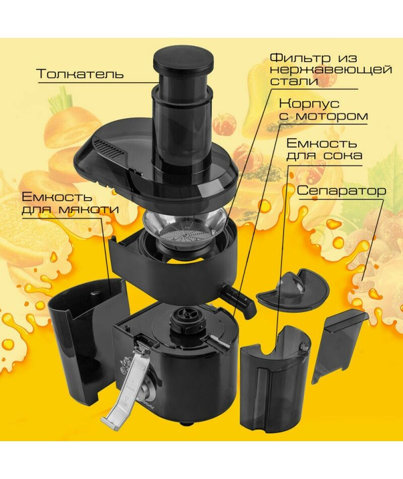 - Комплект поставки: Соковыжималка, Толкатель, Емкость для сока, Руководство по эксплуатации, Гарантийный талон