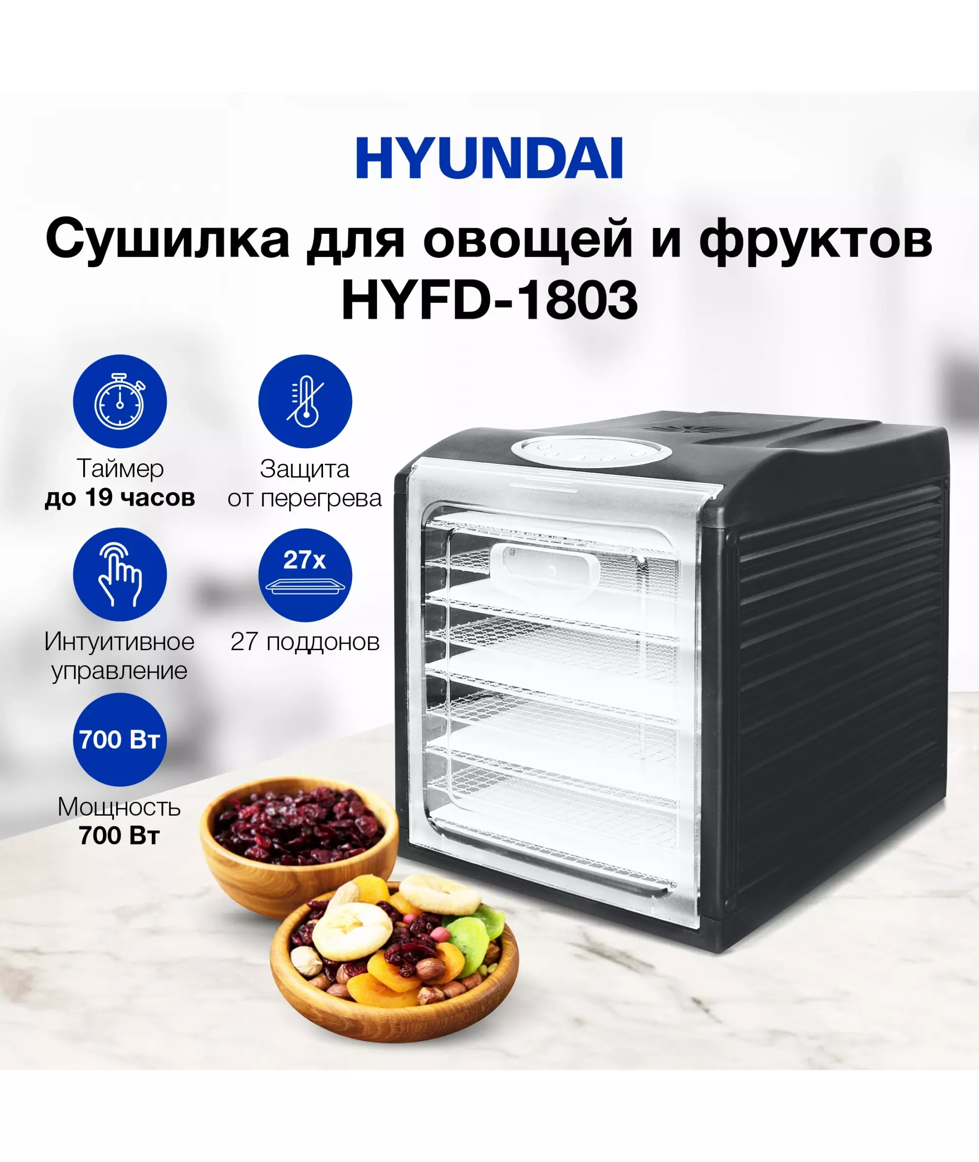 Сушка для фруктов и овощей Hyundai HYFD-1803 27 поддонов 700Вт черный