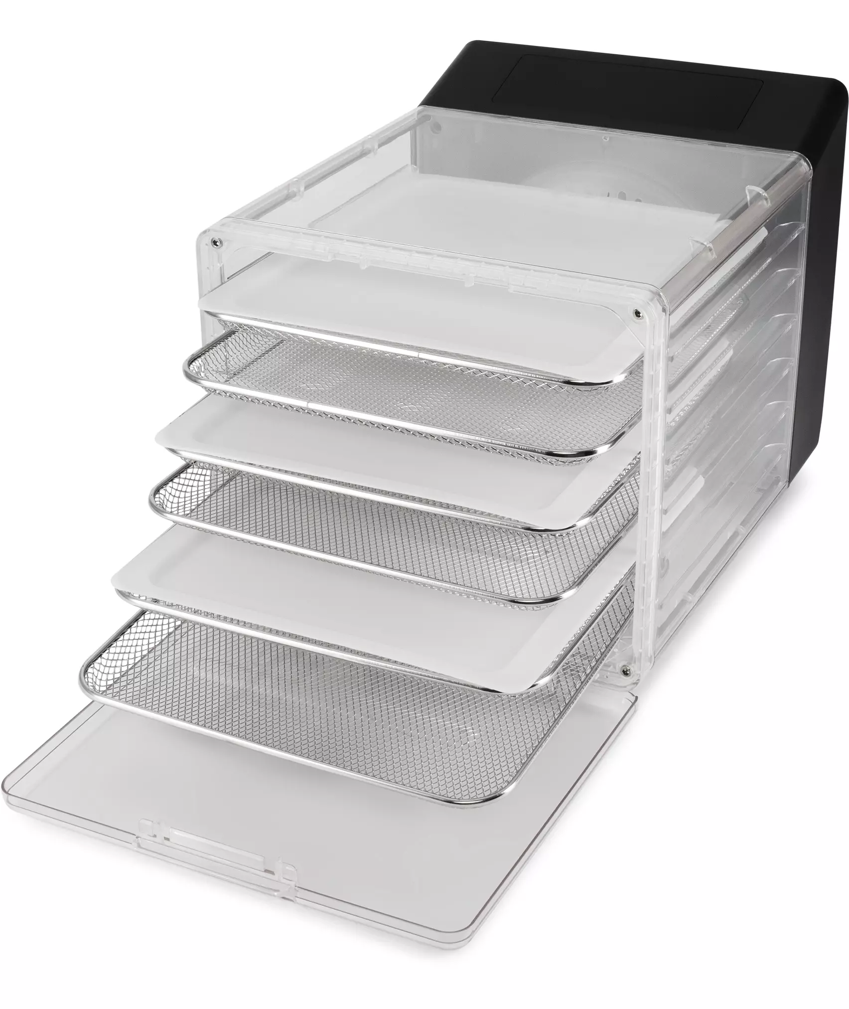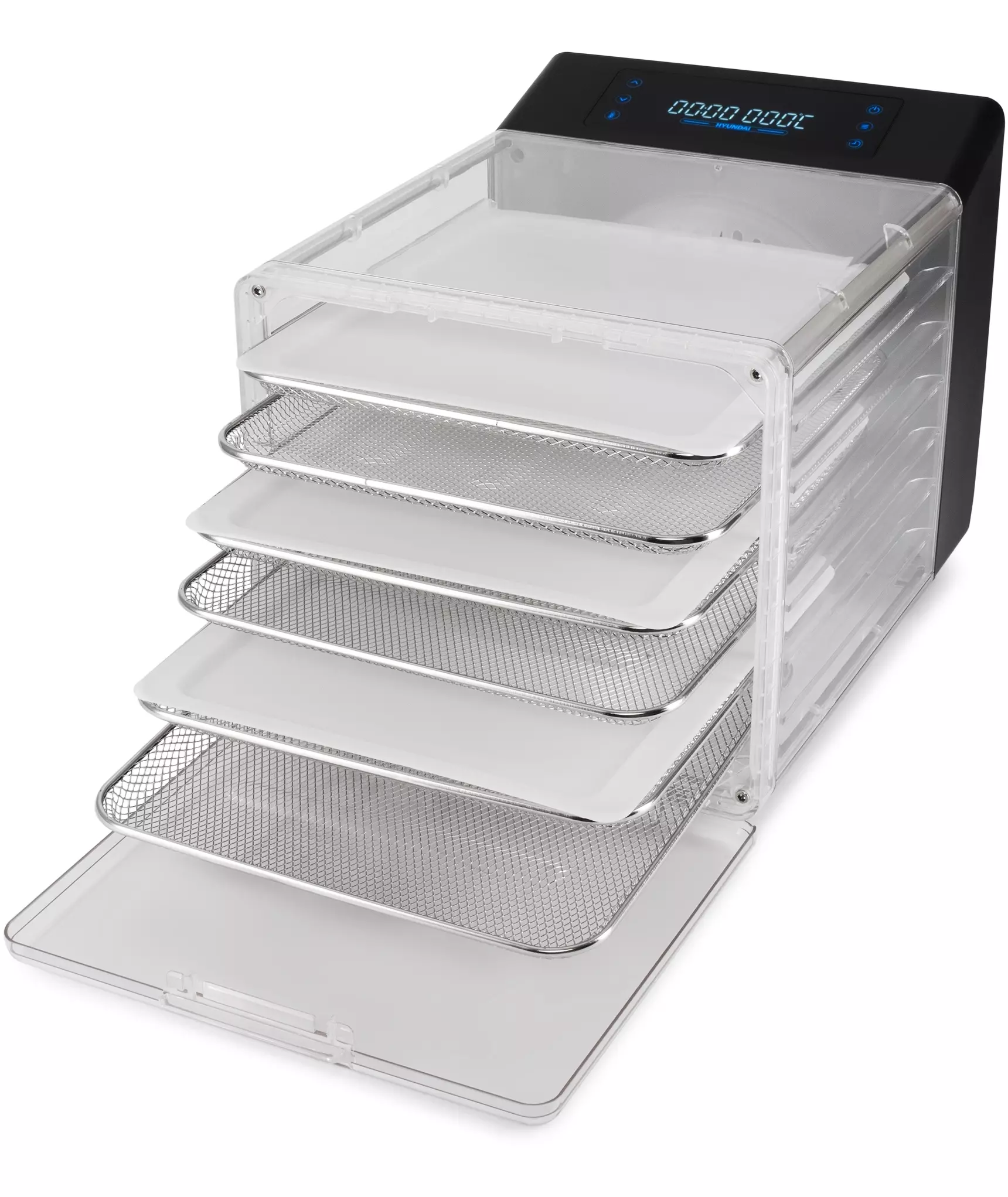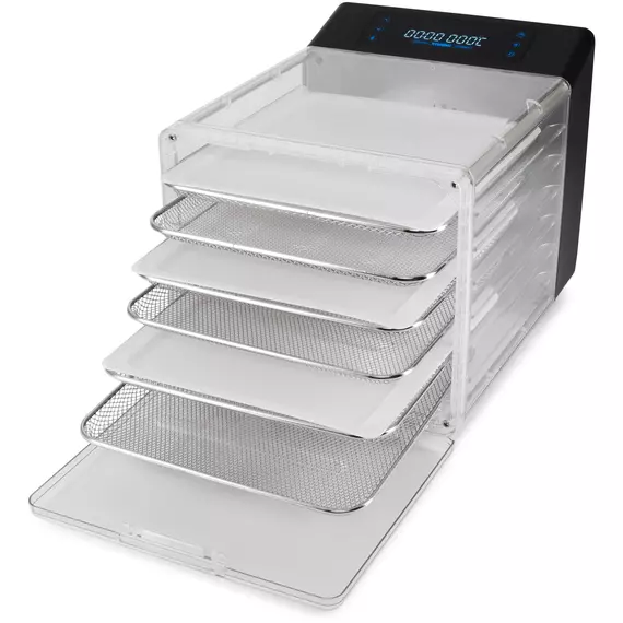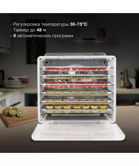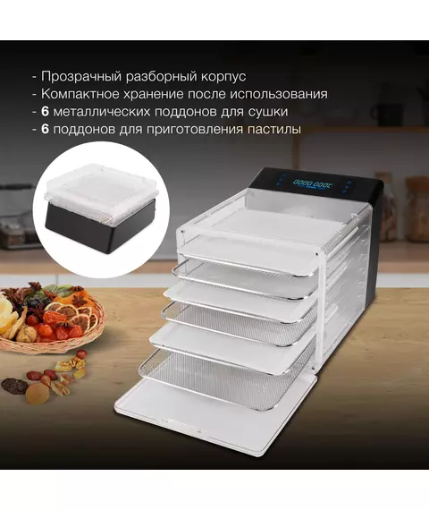 Инновационная, разборная сушильная камера с регулировкой температуры и таймером, для сушения овощей и фруктов, грибов и трав, а так же вяленья мяса и рыбы. Весь необходимый функционал, в удобном форм-факторе с сенсорным управлением.