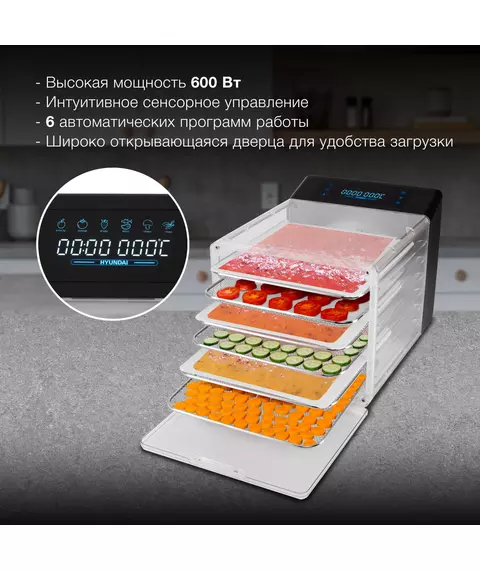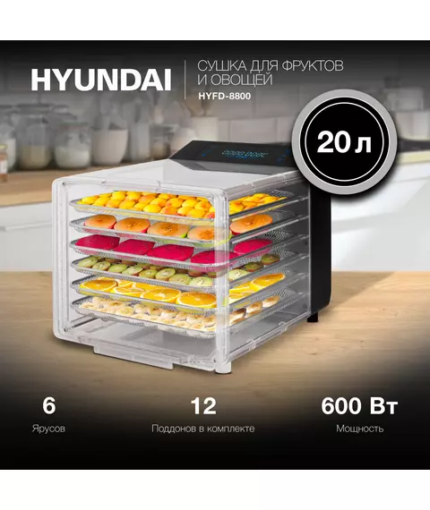 Сушка для фруктов и овощей Hyundai HYFD-8800 12 поддонов 600Вт черный