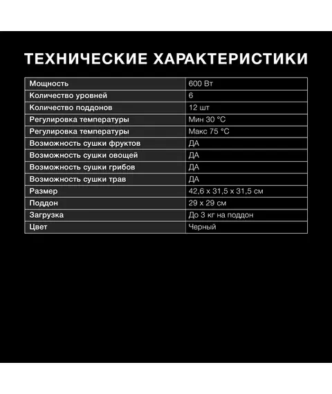 | Особенности | Разборный корпус для компактного хранения. Прозрачный корпус для визуального контроля за сушкой. Откидная дверца для удобства загрузки и выгрузки.В собранном виде Х литров, и очень компактная в разобранном ХсмХсмХсм. |