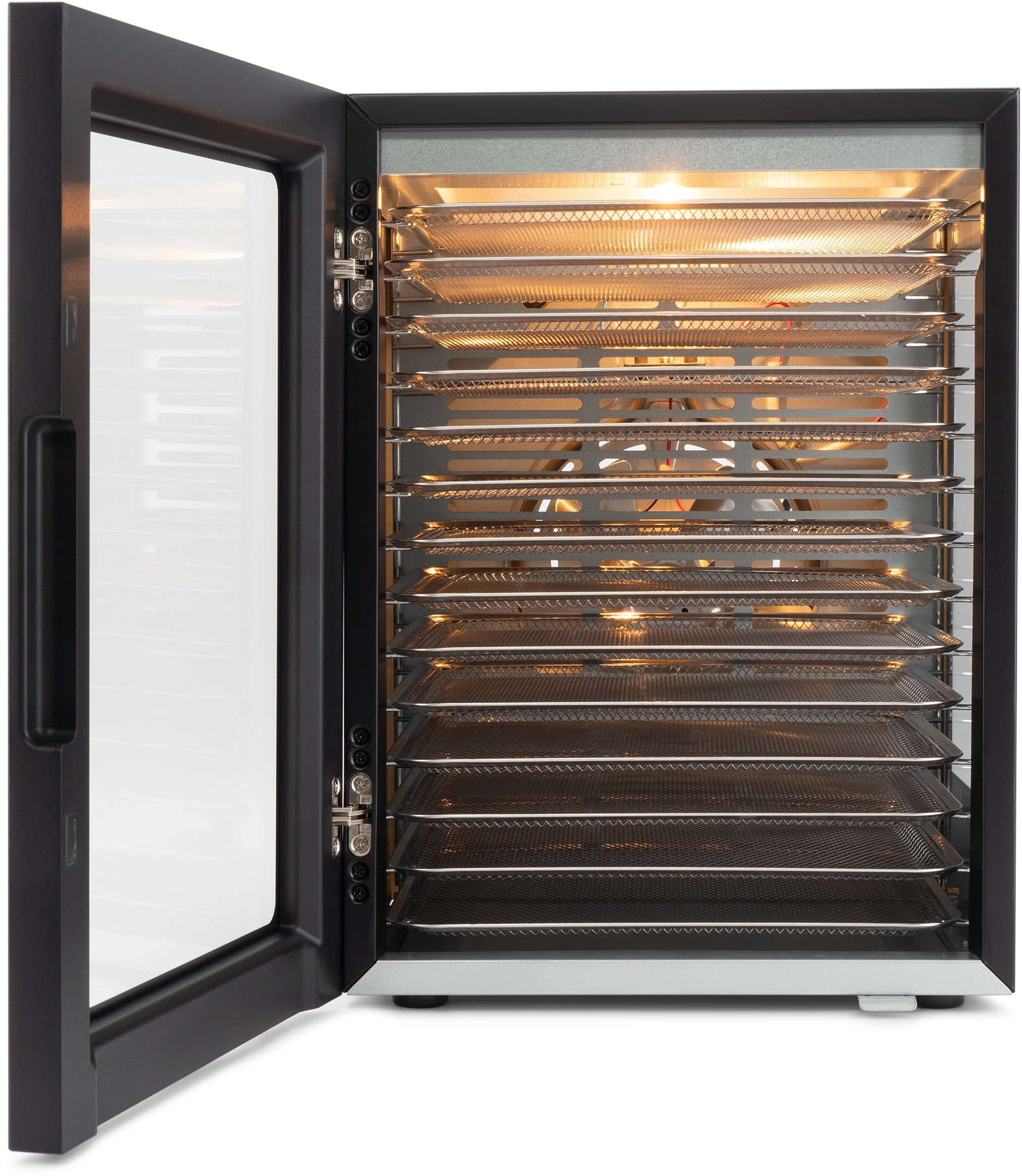Вместительная и стильная сушильная камера в металлическом корпусе, с регулировкой температуры и таймером, для сушения овощей и фруктов, грибов и трав, а так же вяленья мяса и рыбы. Весь необходимый функционал, в удобном форм-факторе с сенсорным управлением.