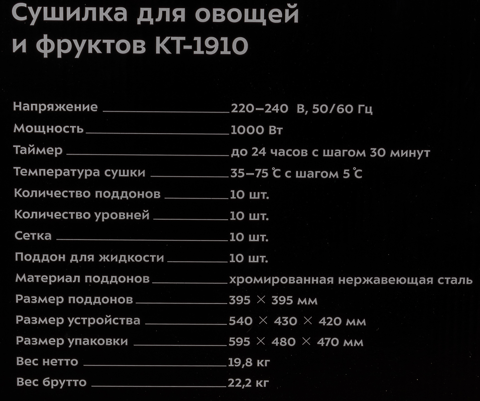 | Особенности | горизонтальный обдув; низкий уровень шума; защита от перегрева;электронное управление; регулировка температуры; таймер до 24 часов с шагом 30 минут; температура сушки: 35-75 °С с шагом 5 °С;нескользящие ножки |
