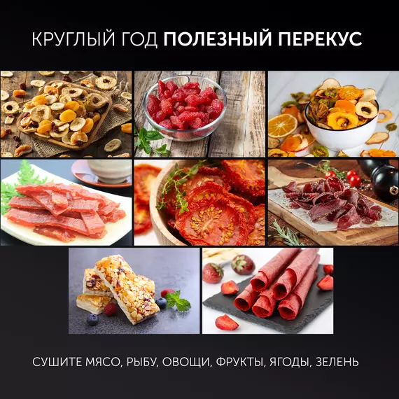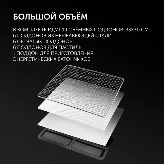 | Особенности | 6 поддонов из нержавеющей стали. 6 гибких сетчатых листов. 6 гибких поддонов для пастилы. 1 поддон для приготовления энергетических батончиков. |