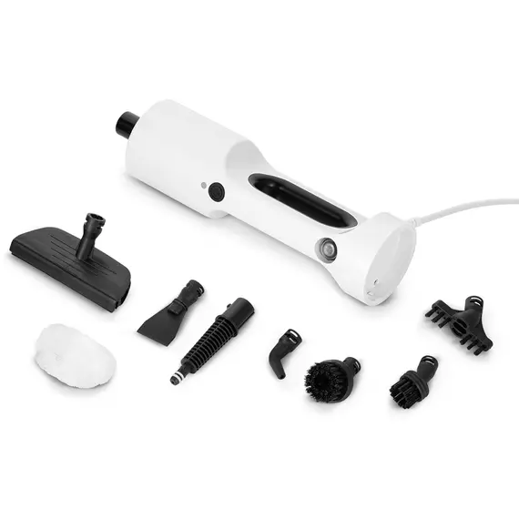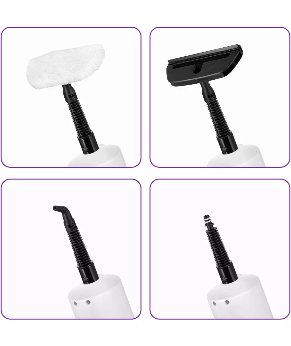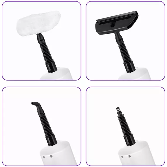 | Комплектация | тряпка для пола, рамка для ковра, насадка для отпаривания с резиновым скребком, тряпка для отпаривания, струйная насадка, скребок, плоская нейлоновая щетка, малая круглая нейлоновая щетка, большая круглая нейлоновая щетка, угловая насадка |