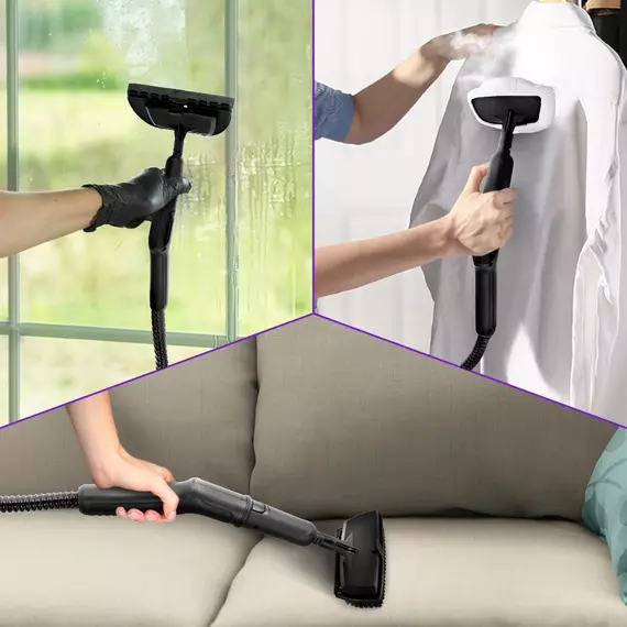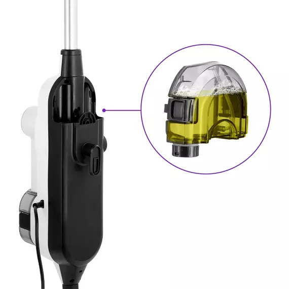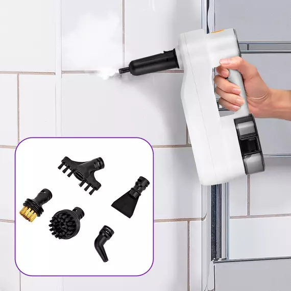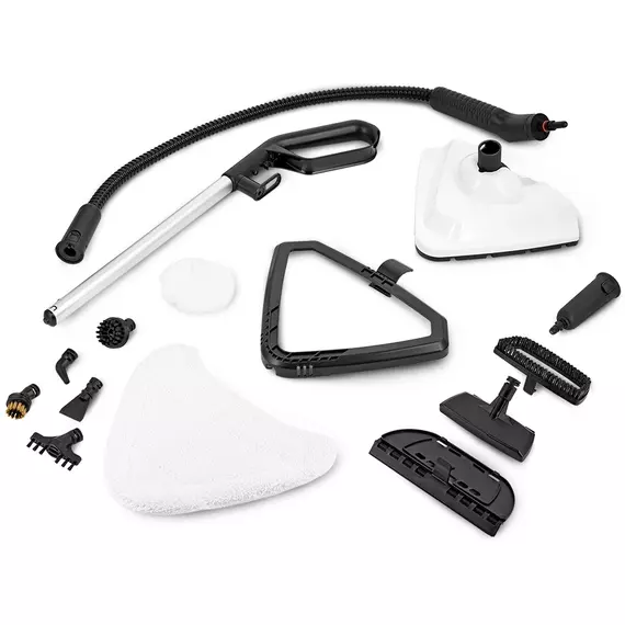 | Комплектация | тряпка для пола, рамка для ковра, паровой шланг, струйная насадка, насадка для отпаривания с резиновым скребком, тряпка для отпаривания, скребок для стекла с резиновой вставкой, ворсовая щетка, угловая насадка, скребок, плоская нейлоновая щетка, круглая нейлоновая щетка, круглая латунная щетка |