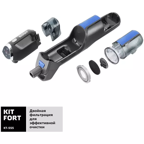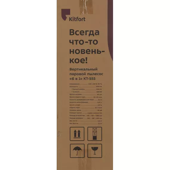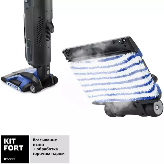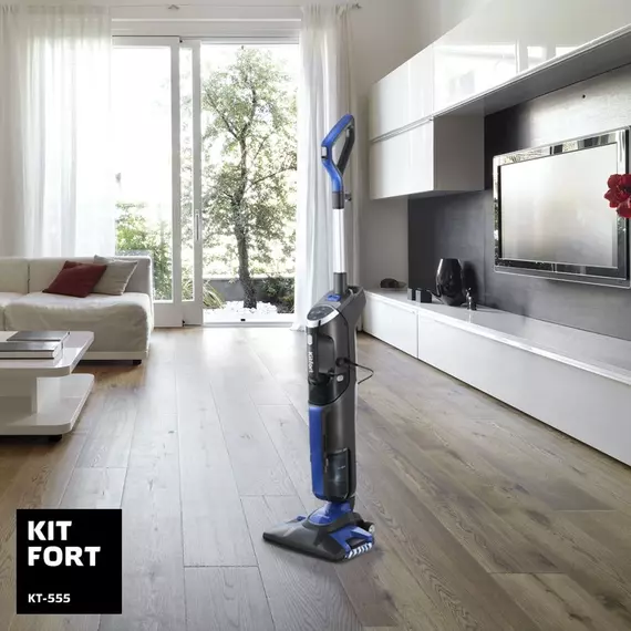 Вертикальный пылесос Kitfort KT-555 с функциями паровой швабры и ручного пароочистителя удобен при локальной и генеральной уборке. Он всасывает пыль и мелкий мусор, а затем очищает поверхность от грязи, въевшихся пятен и жира при помощи горячего пара.