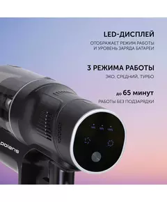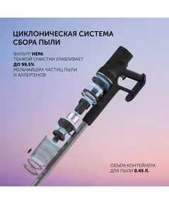 450 Вт Высокая мощность для ежедневной уборки LED дисплей Насадка для влажной уборки Время работы до 65 минут БЕСПРОВОДНОЙ Вертикальный и компактный ручной МОЮЩИЙ 4 НАСАДКИ Характеристики Основные характеристики Тип Вертикальный пылесос Мощность 450 Вт Мощность...