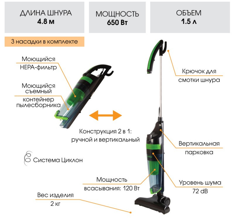 - Конструкция 2 в 1: ручной и вертикальный