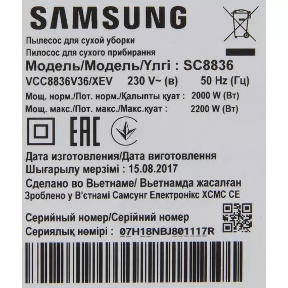 | Аксессуары в комплекте | насадка для мягкой мебели, насадка для пола и ковров, щелевая насадка |