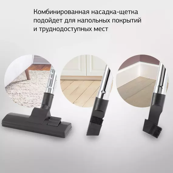 | Аксессуары в комплекте | насадка для пола и ковров, щелевая насадка, щетка |