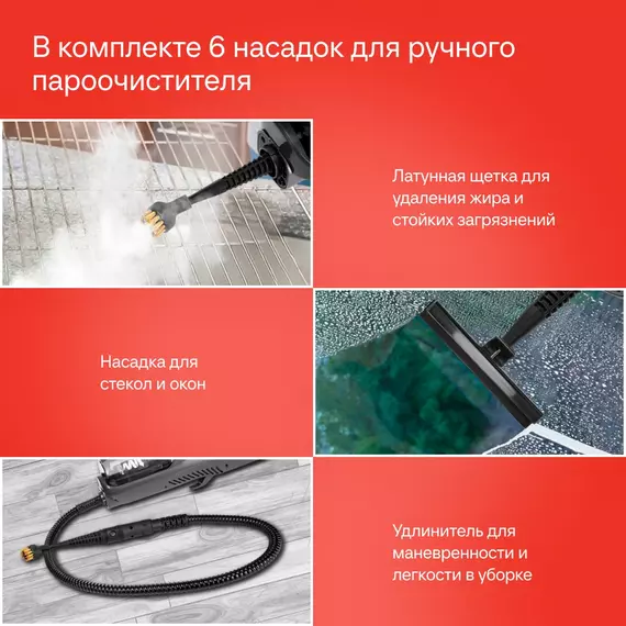 | Комплектация | насадка для влажной уборки ковров/полов, насадка для влажной уборки мягкой мебели, насадка для мытья окон, насадка для мягкой мебели, насадка для пола и ковров, щелевая насадка |