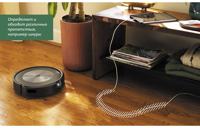 - Робот-пылесос Roomba® j7 использует систему навигации PrecisionVision, чтобы распознавать объекты и обходить препятствия, такие как кабели и продукты жизнедеятельности домашних животных.