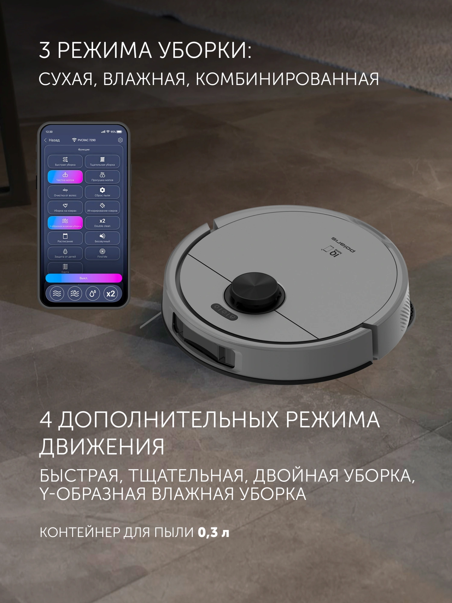 | Режимы движения робота-пылесоса | Y-образный, вдоль стены, точечный |