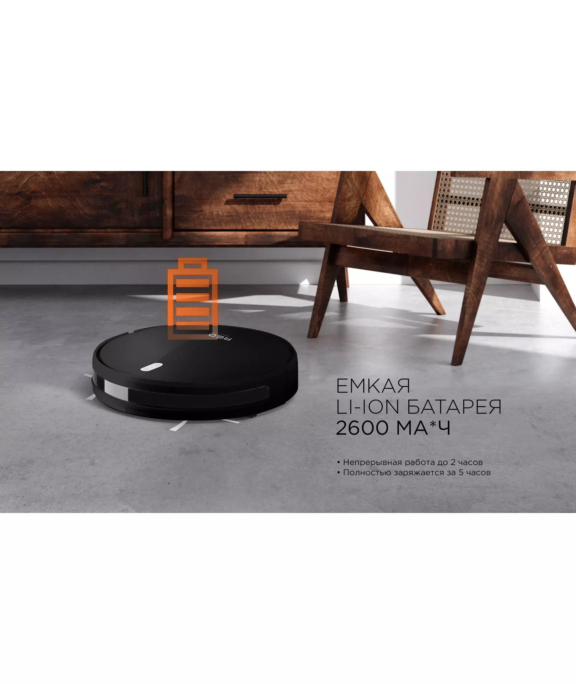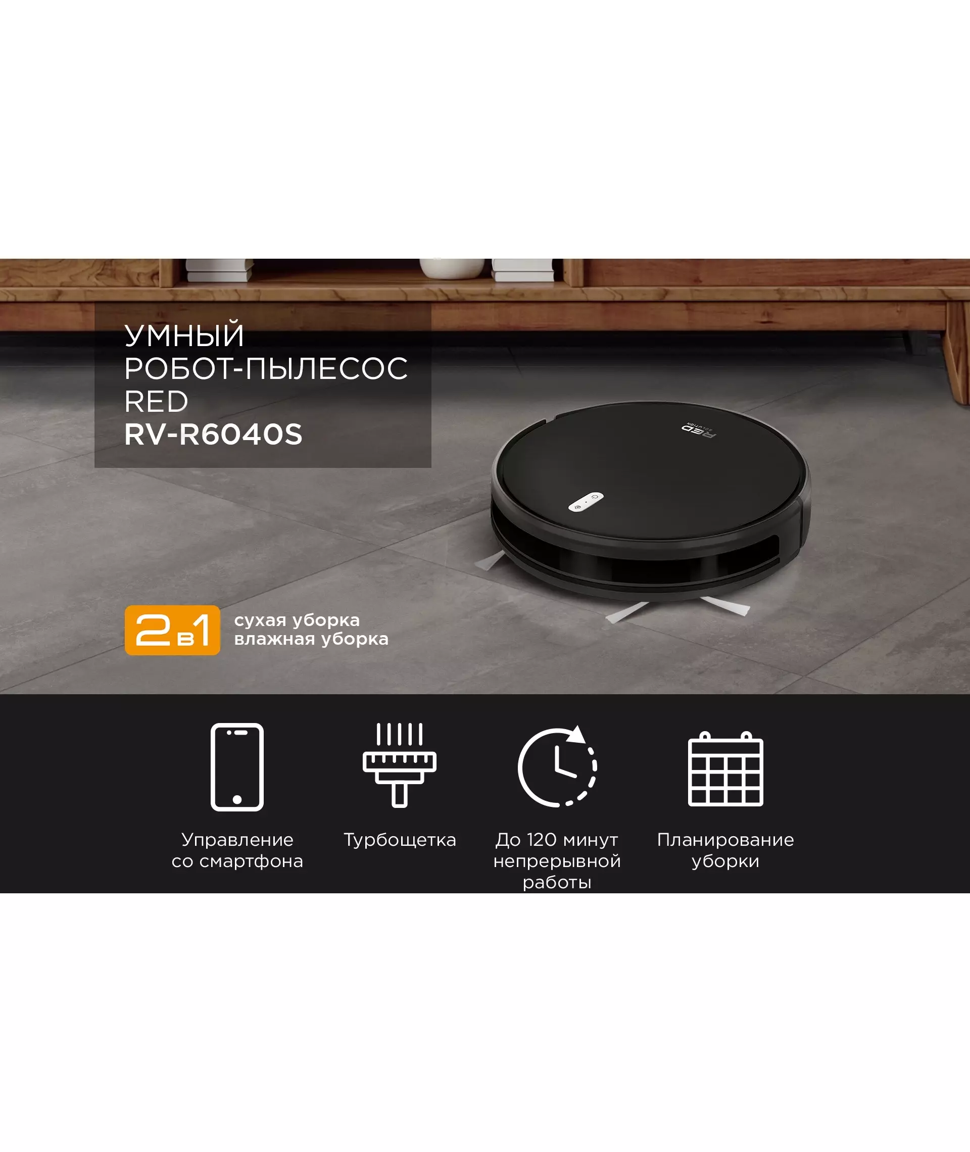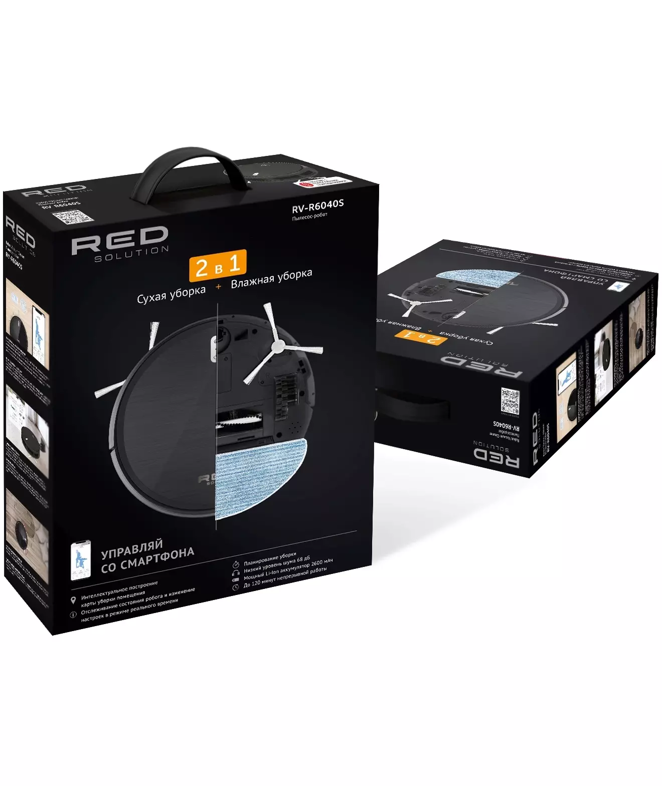 RV-R6040S – это инновационный робот-пылесос «2 в 1», который сделает сухую и влажную уборку. Литий-ионная батарея емкостью 2600 мА*ч обеспечит бесперебойную работу робота-пылесоса на протяжении 120 минут – за это время RV-R6040S успеет сделать тщательную уборку даже в большой квартире.
