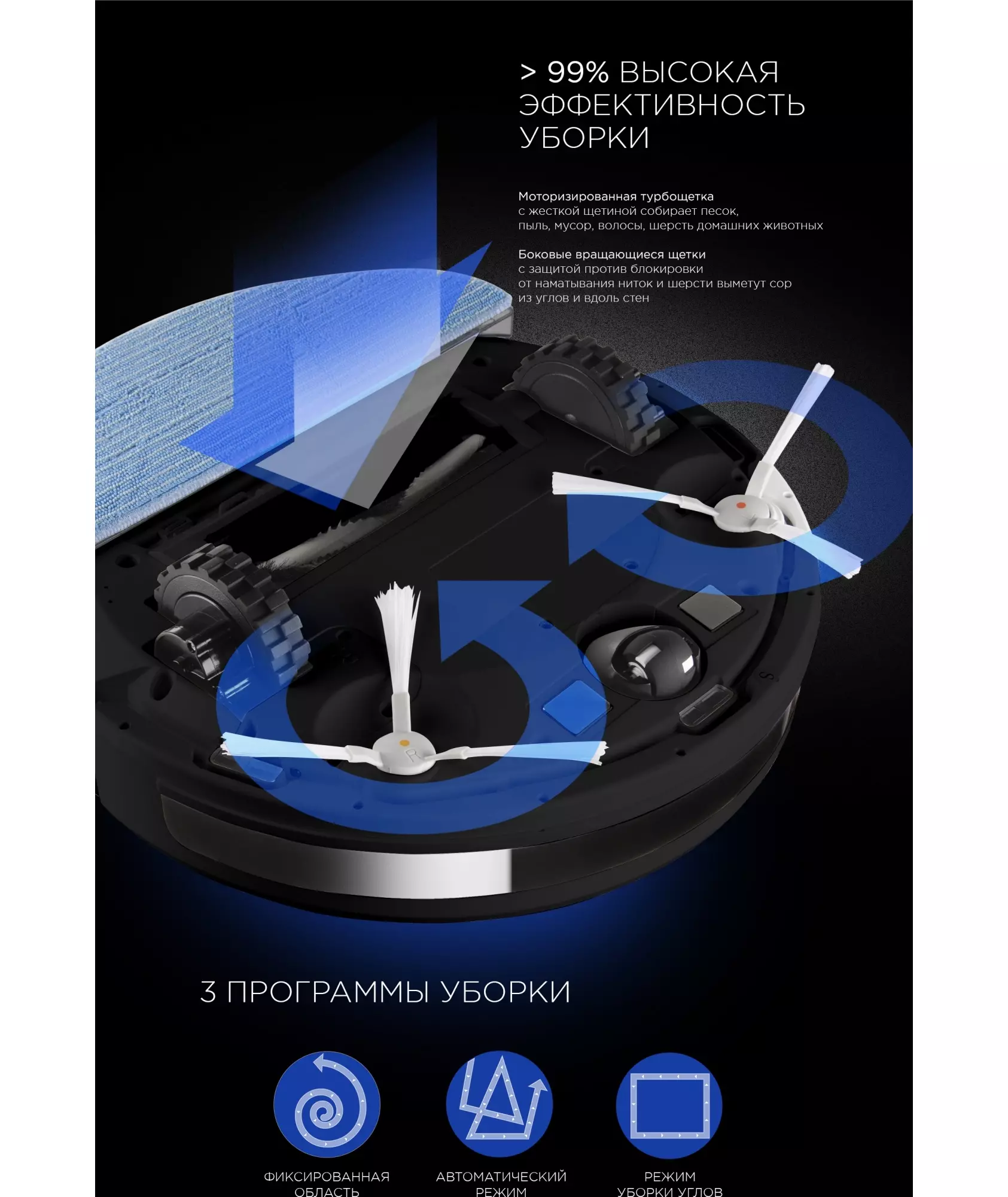 | Режимы движения робота-пылесоса | вдоль стены, очистка углов, по спирали |