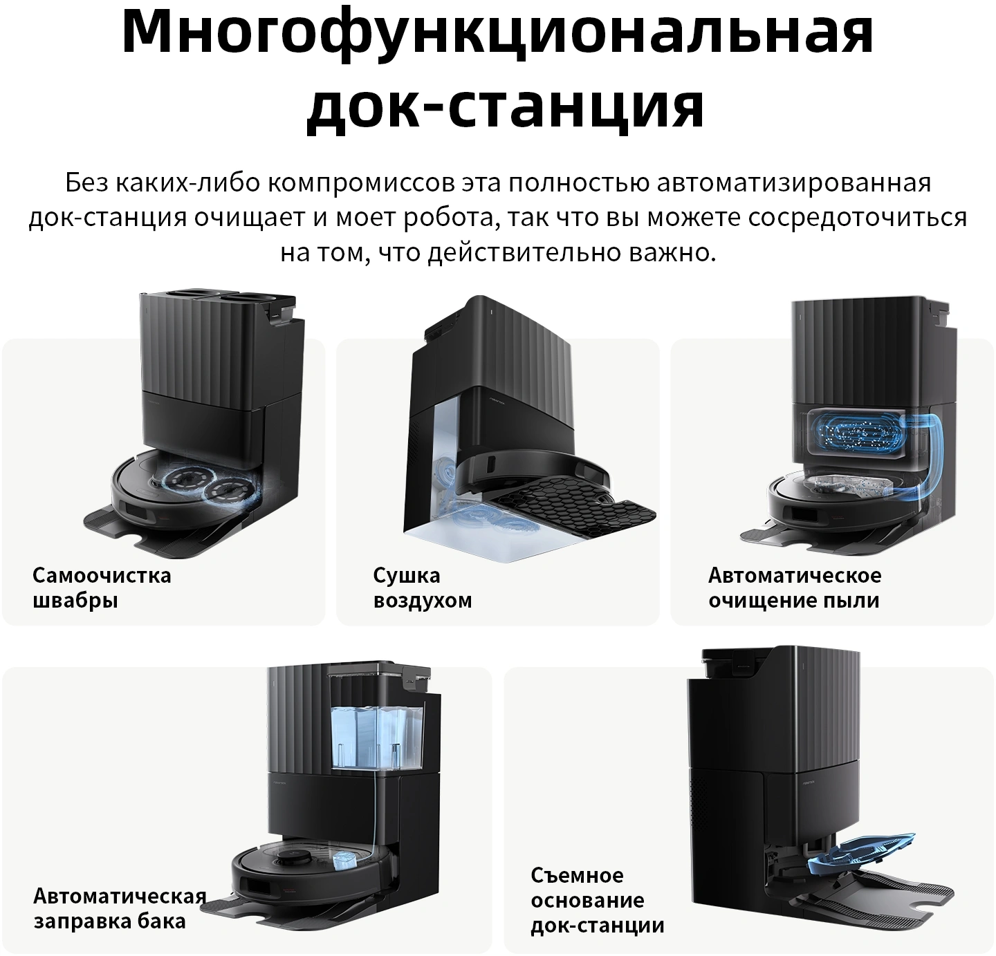 | Функции и особенности базы | автоматическая очистка насадки, автоматическая подача воды, автоматическая сушка насадки, резервуар для грязной воды, резервуар для чистой воды, самоочистка пылесборника |