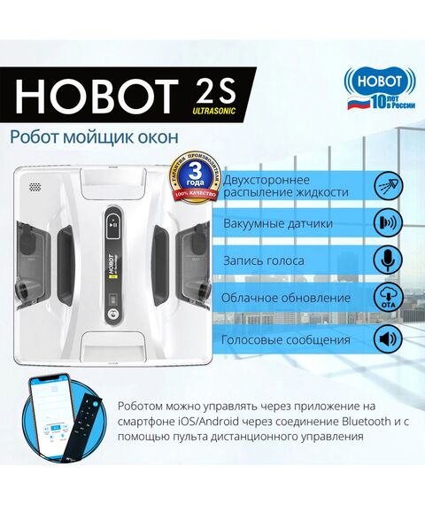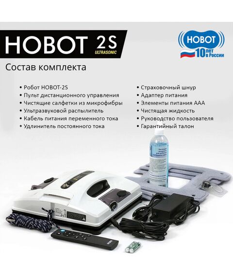 | Комплектация | робот Hobot-2S Ultrasonic; страховочный шнур; пульт дистанционного управления; адаптер питания; кабель питания переменного тока; удлинитель постоянного тока; чистящая жидкость (220 мл.); ультразвуковой распылитель Ultrasonic; чистящие салфетки (3 шт.); руководство пользователя, гарантийный талон. |