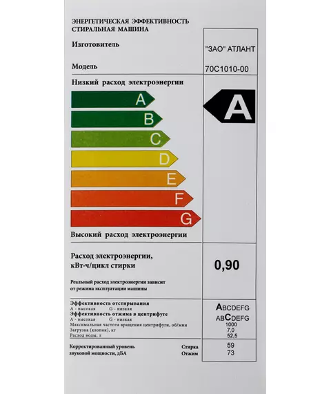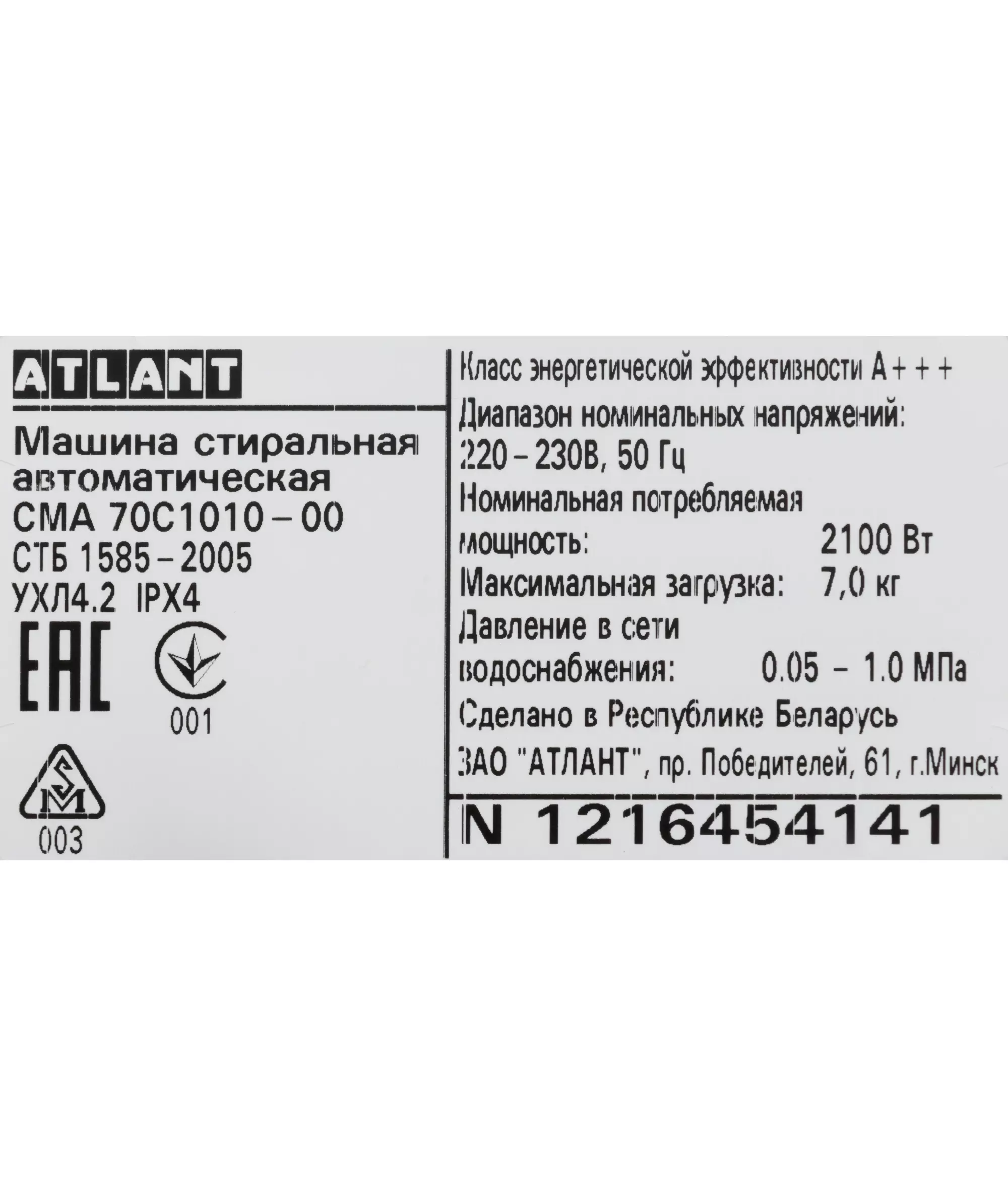 Стиральная машина Атлант 70С1010 класс: A+++ загр.фронтальная макс.:7кг белый