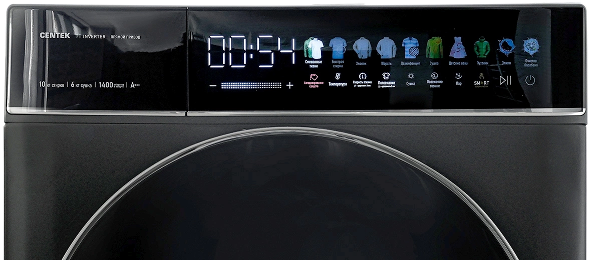 Стиральная машина Centek CT-1976 класс A+++, фронтальная, макс. 10кг, с сушкой, черный, инвертор