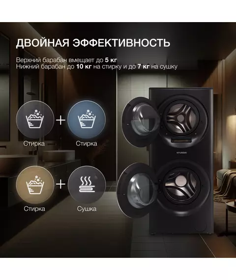 | Дополнительно | Максимальная загрузка верхнего барабана 5 кг, нижнего - 10 кг. Загрузка 15 кг возможна при одновременной стирке в двух барабанах. |