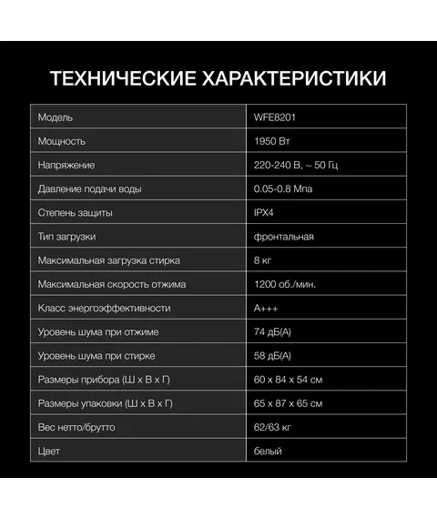 Стиральная машина Hyundai WFE8201 класс: A+++, загр.фронтальная, макс.:8кг, белый, инвертор