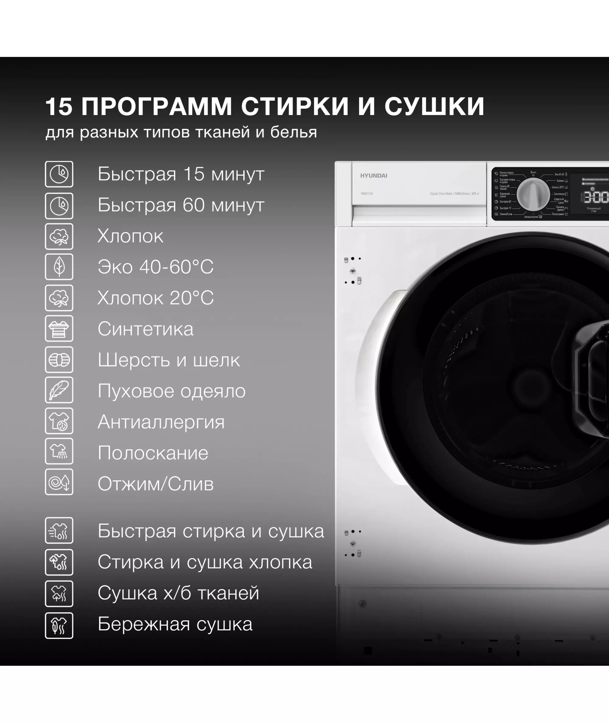 ECO 40-60, Хлопок, Хлопок 20°C, Синтетика, Шерсть и шелк, Пуховое одеяло, Антиаллергия, Полоскание, Отжим/Слив, Быстрая стирка 15 мин, Быстрая стирка 60 мин, Стирка и сушка хлопка, Быстрая стирка и сушка, Сушка х/б тканей, Бережная сушка