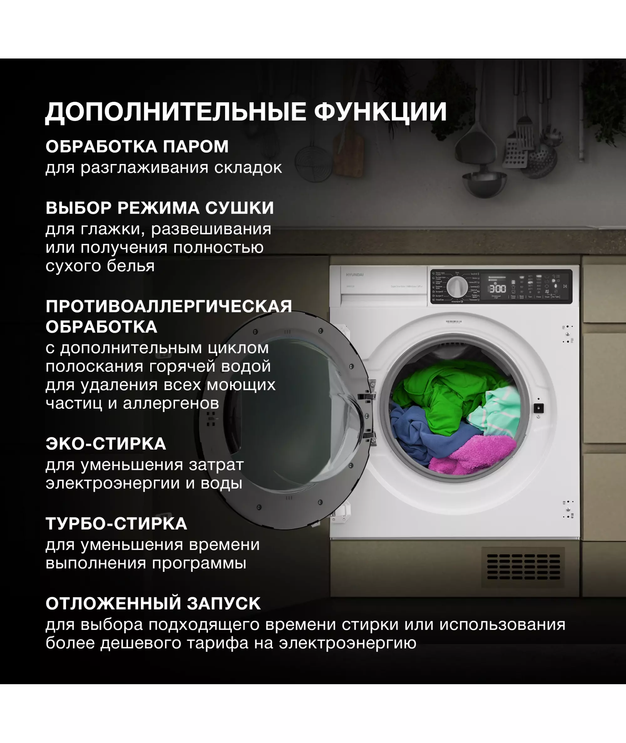 | Дополнительно | Дополнительные функции предварительной стирки, полоскания, обработки паром, гипоаллергенной функции, эко и быстрой стирки |