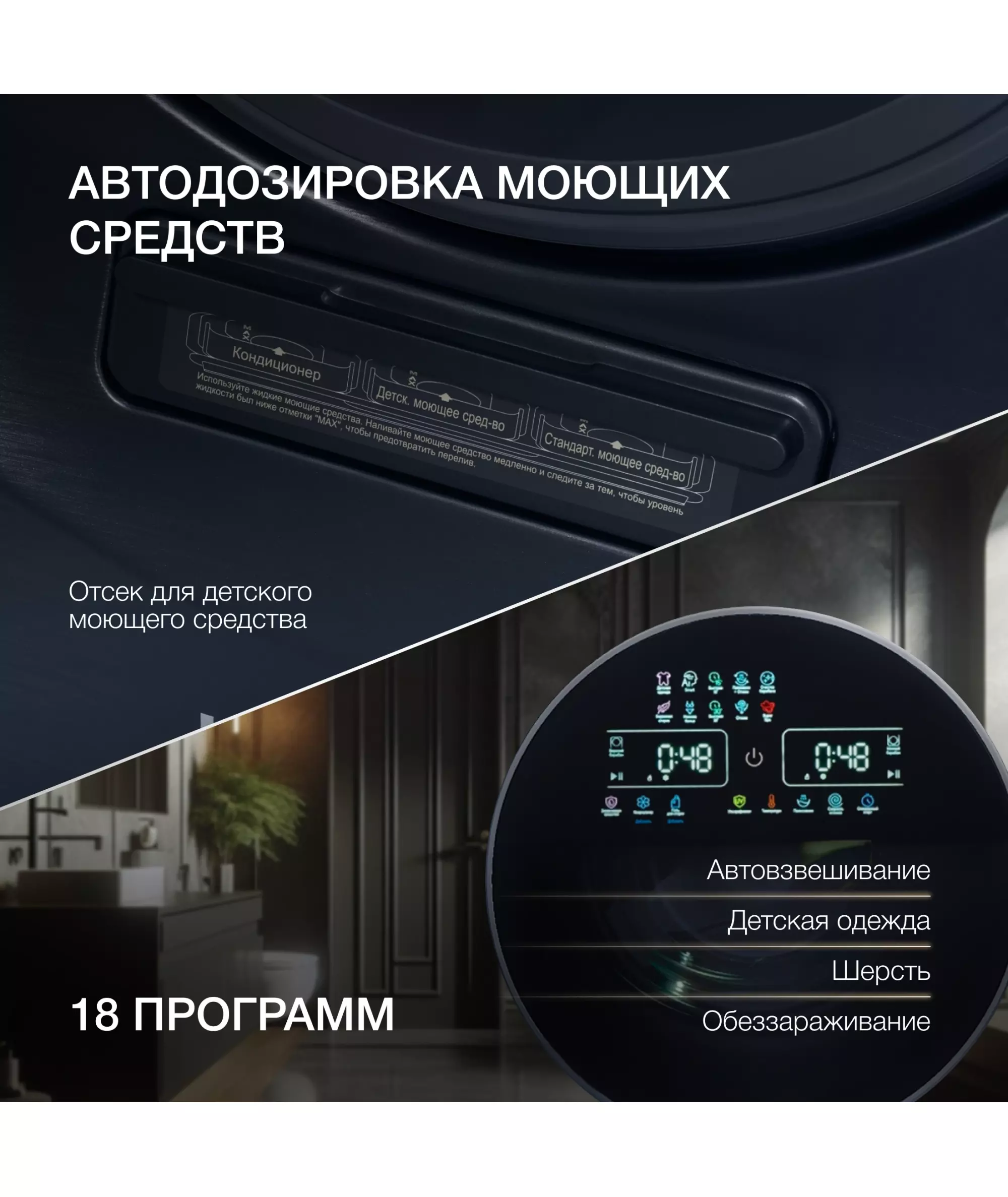 | Безопасность и управление | дисплей, защита от протечек, сенсорная панель управления, таймер отсрочки запуска |