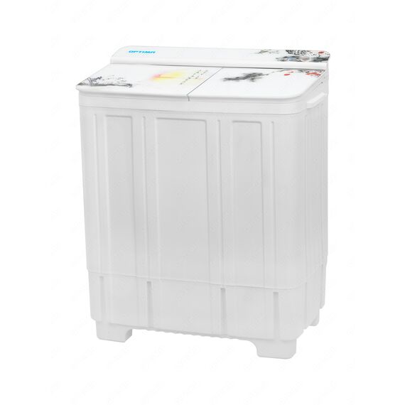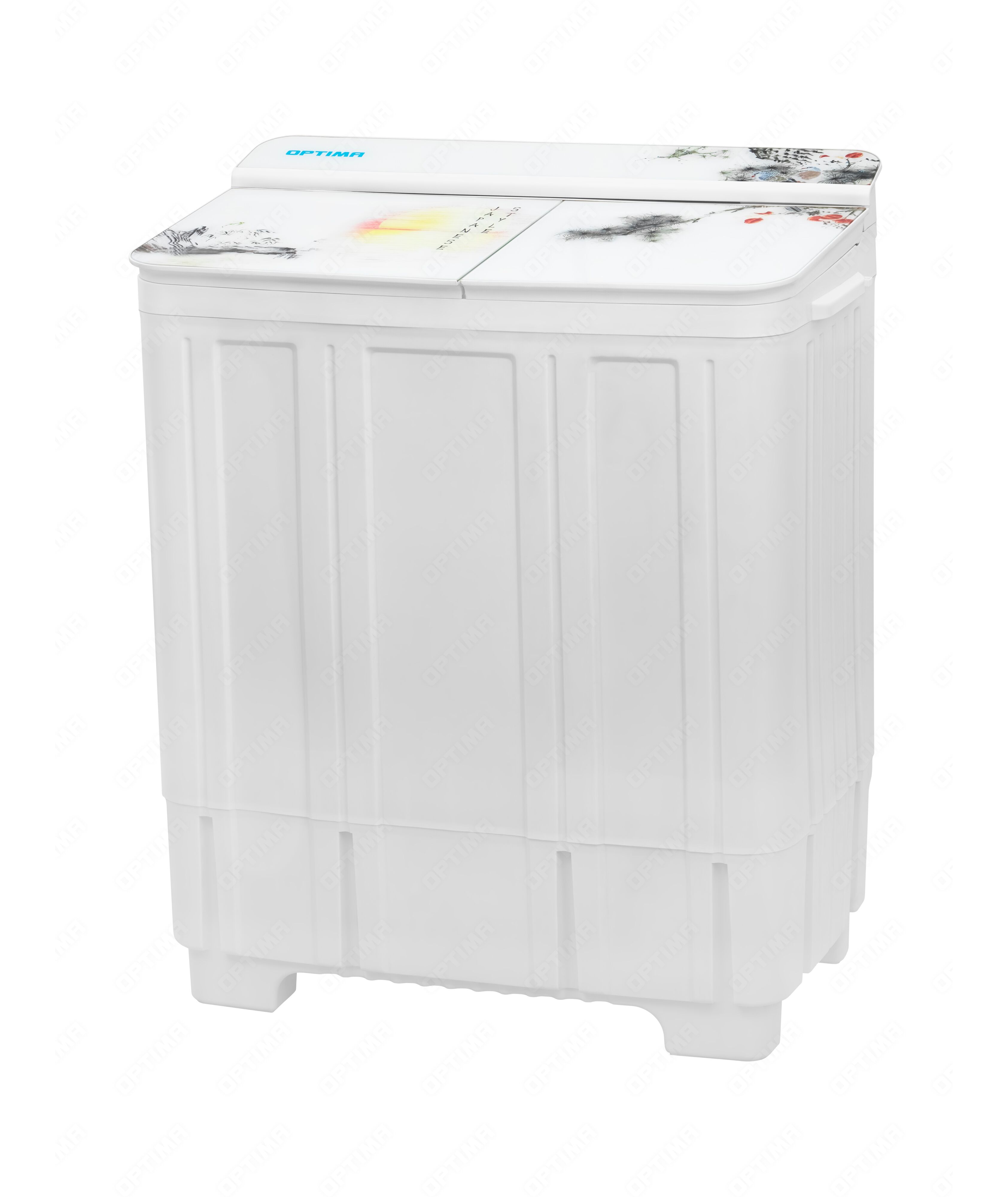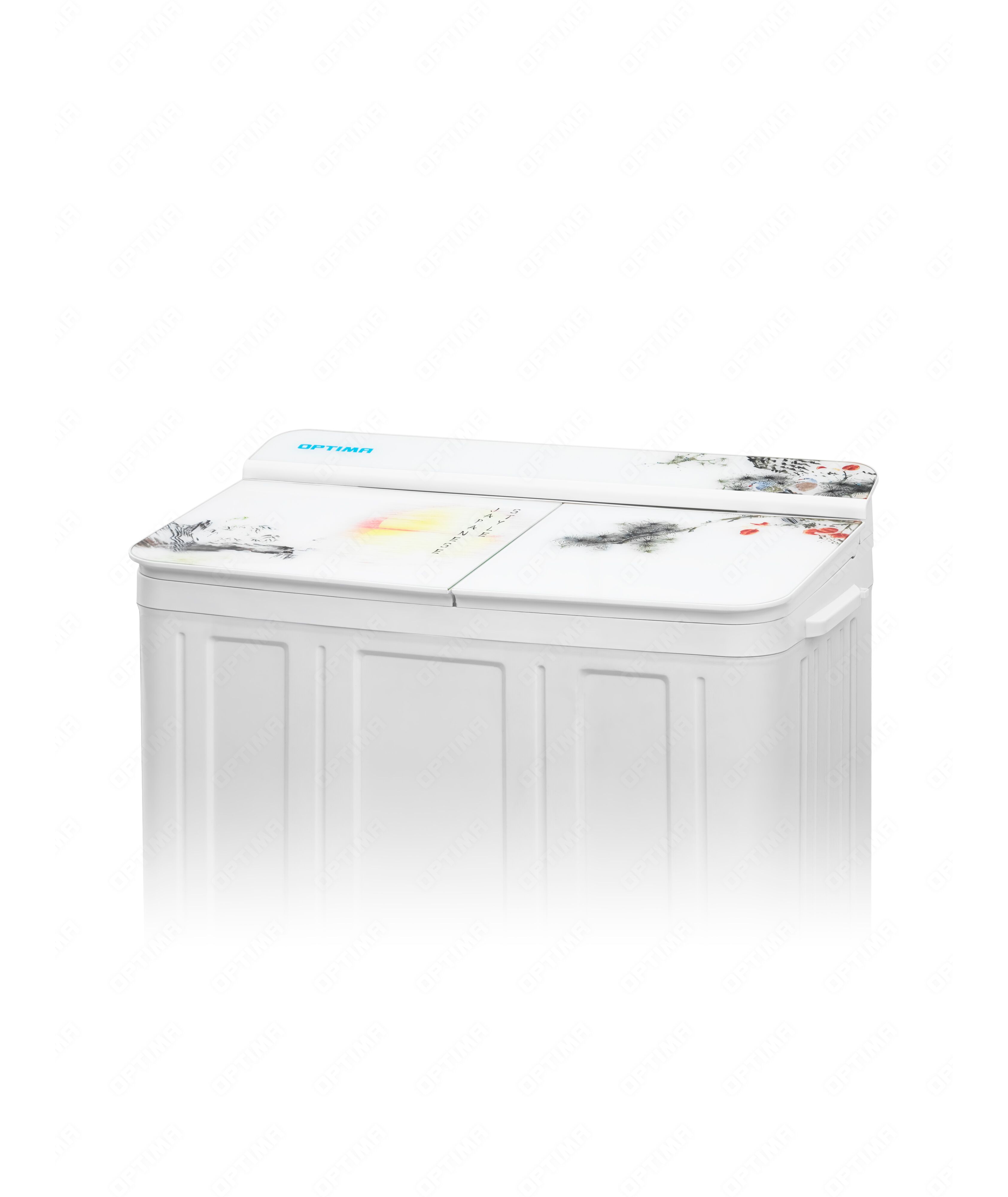 Стиральная машина OPTIMA МСП-88СТ Японский стиль, полуавтомат, встроенный сливной насос, материал бака нержавеющая сталь, стеклянная крышка с принтом, загрузка 8кг/6кг, мощность стирки 550 Вт, отжим 1350 об/мин, фильтр от ворса