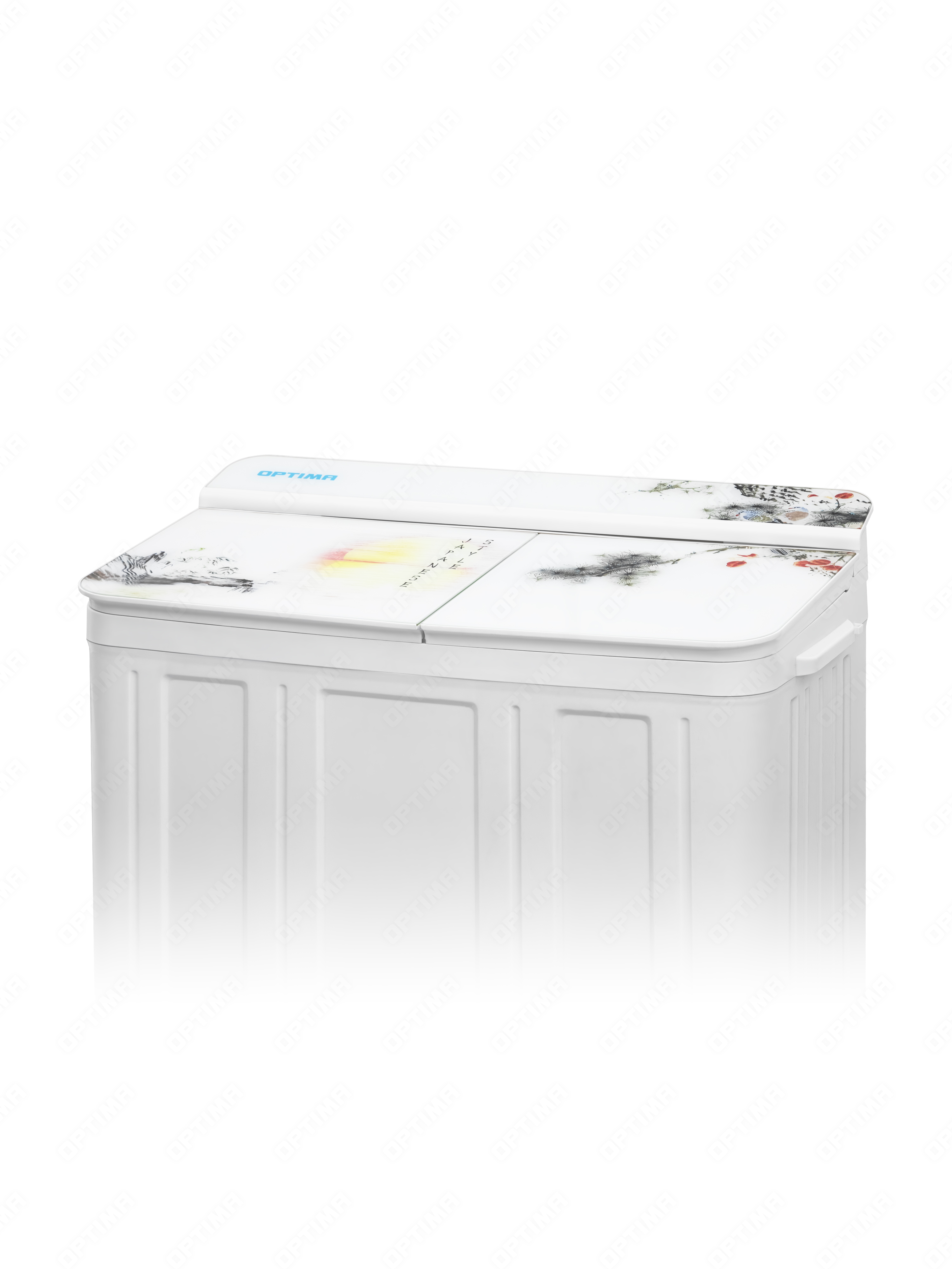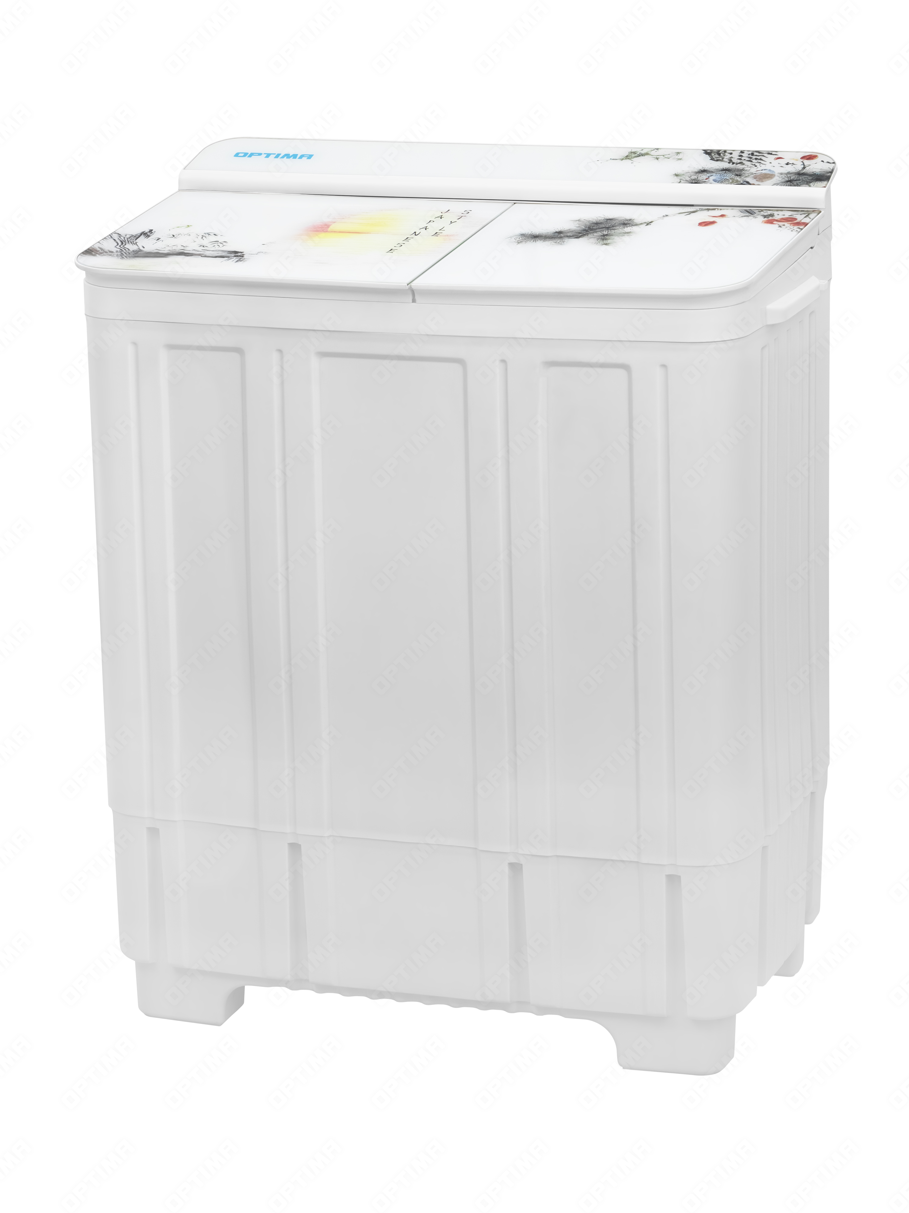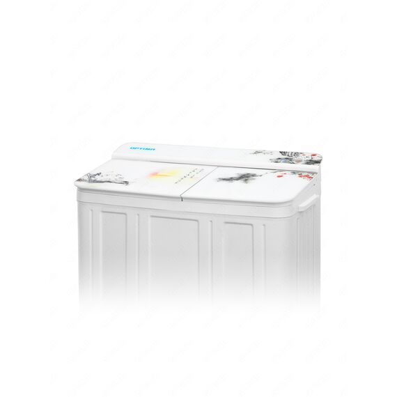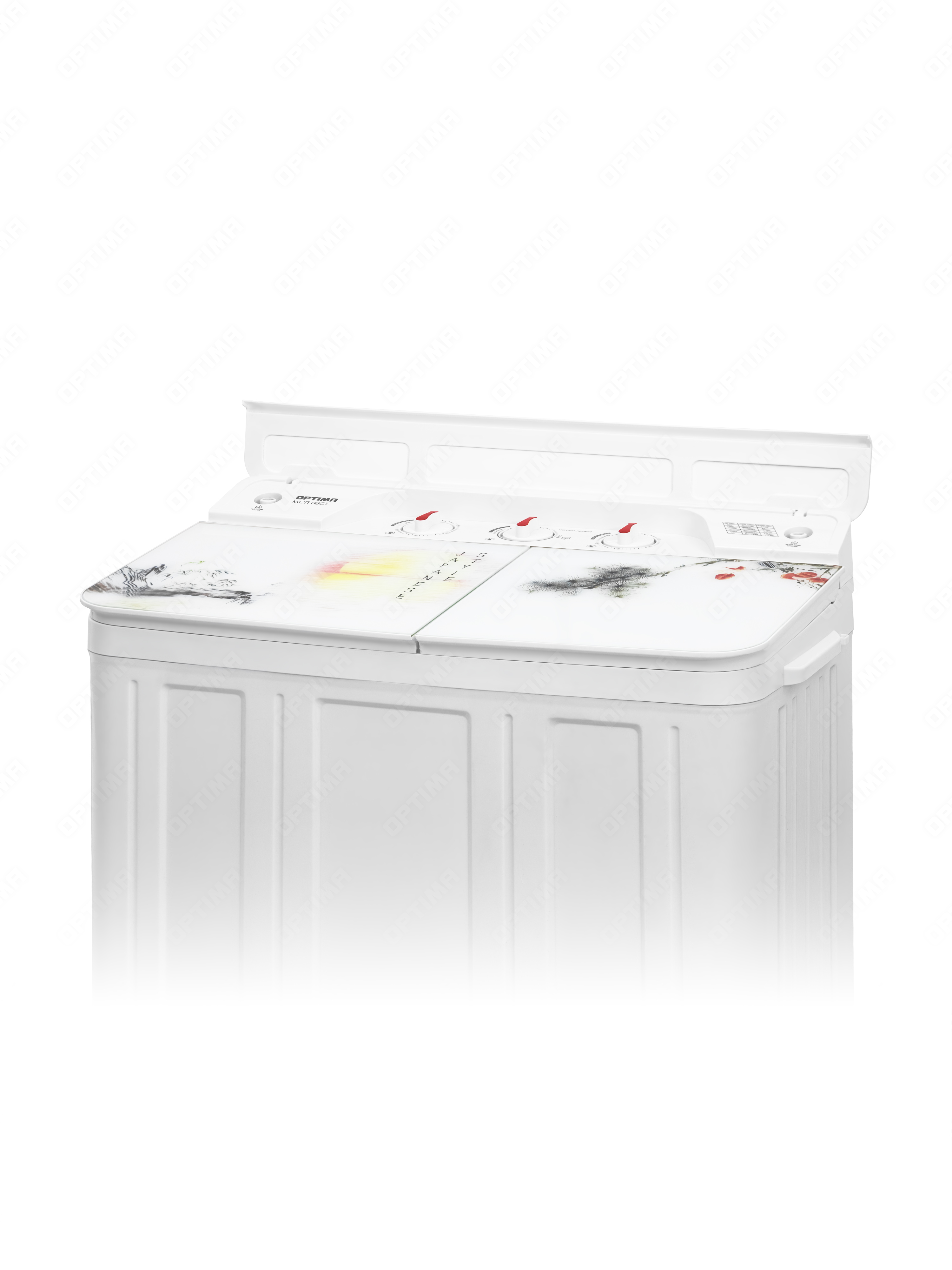 Стиральная машина OPTIMA МСП-88СТ Японский стиль, полуавтомат, встроенный сливной насос, материал бака нержавеющая сталь, стеклянная крышка с принтом, загрузка 8кг/6кг, мощность стирки 550 Вт, отжим 1350 об/мин, фильтр от ворса