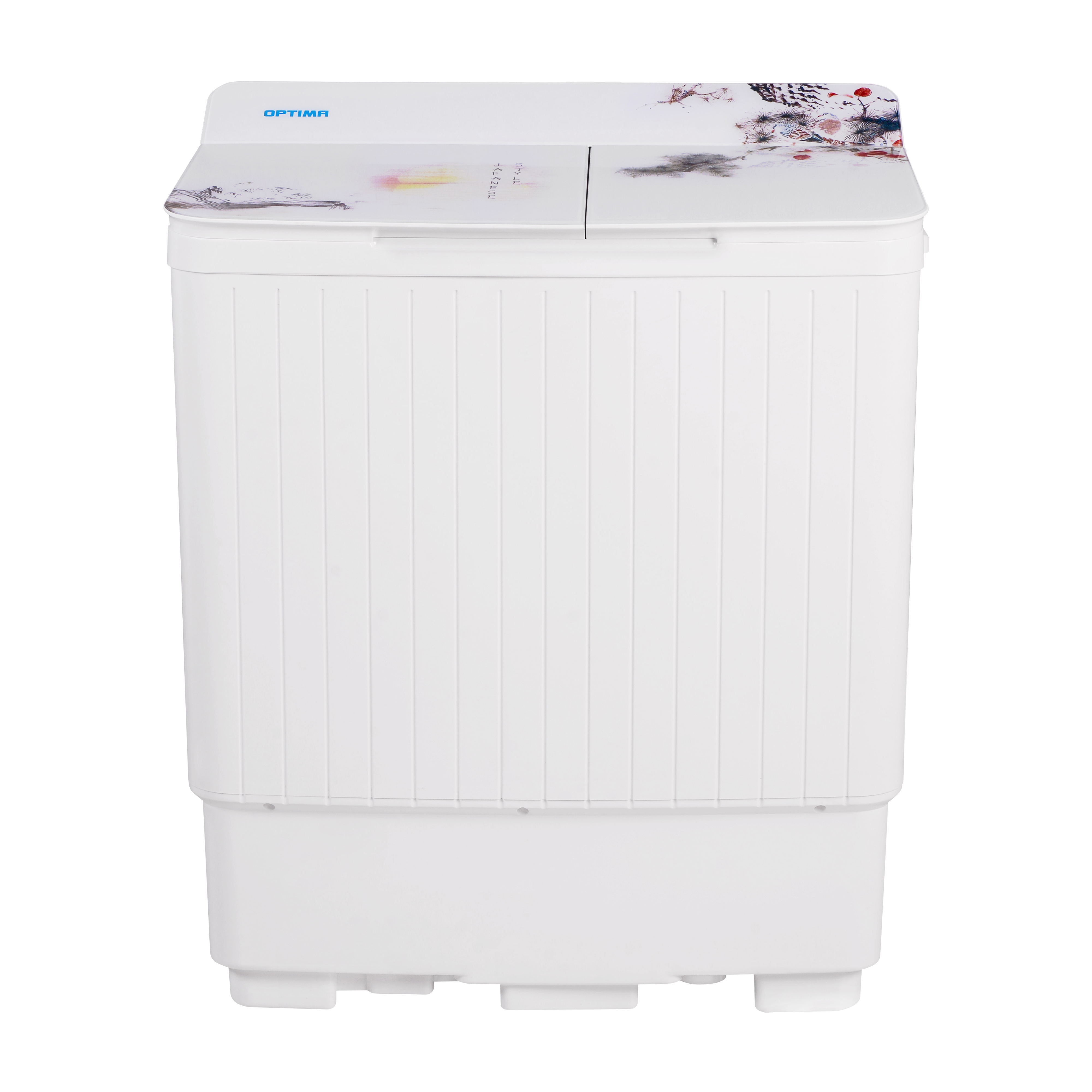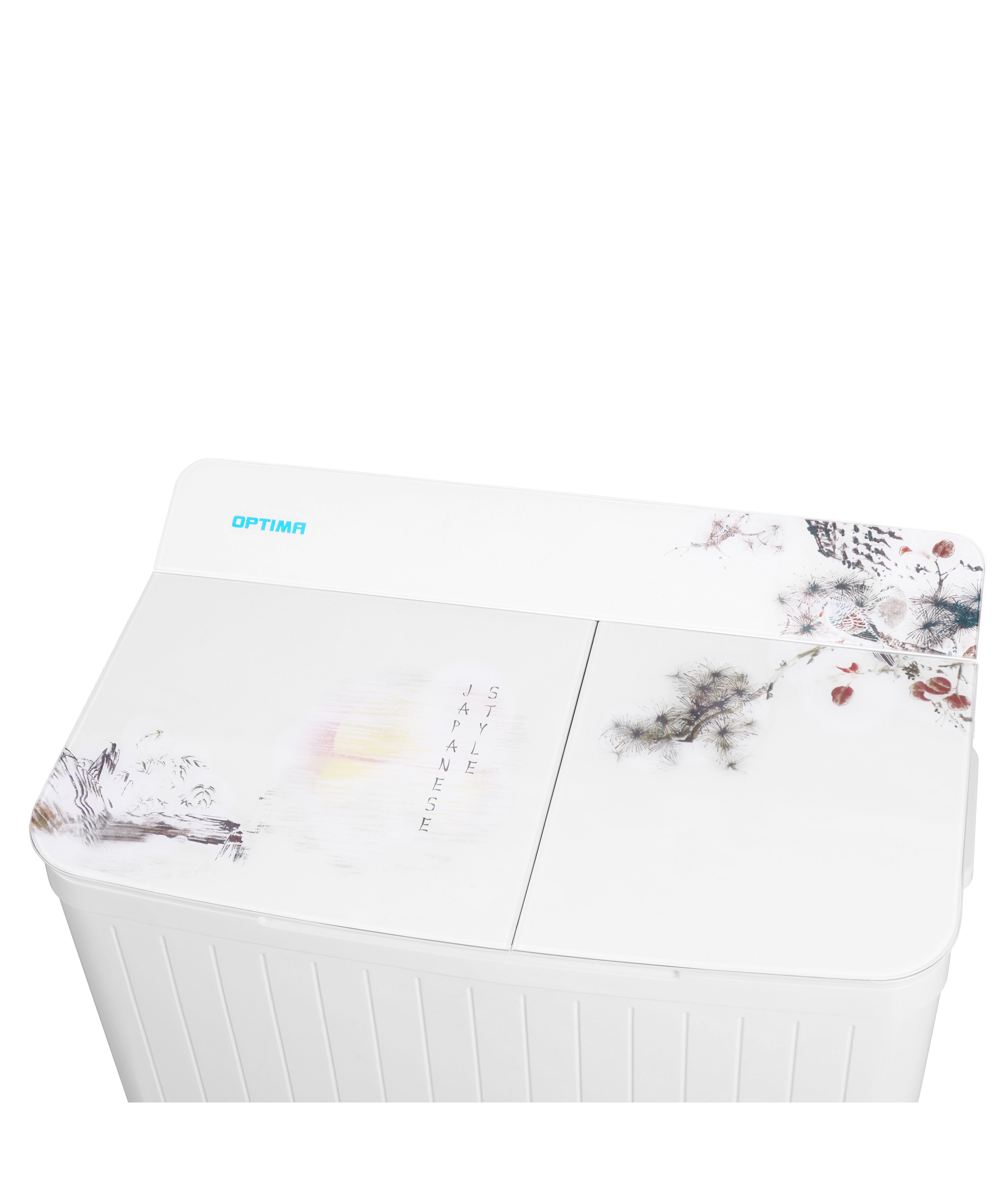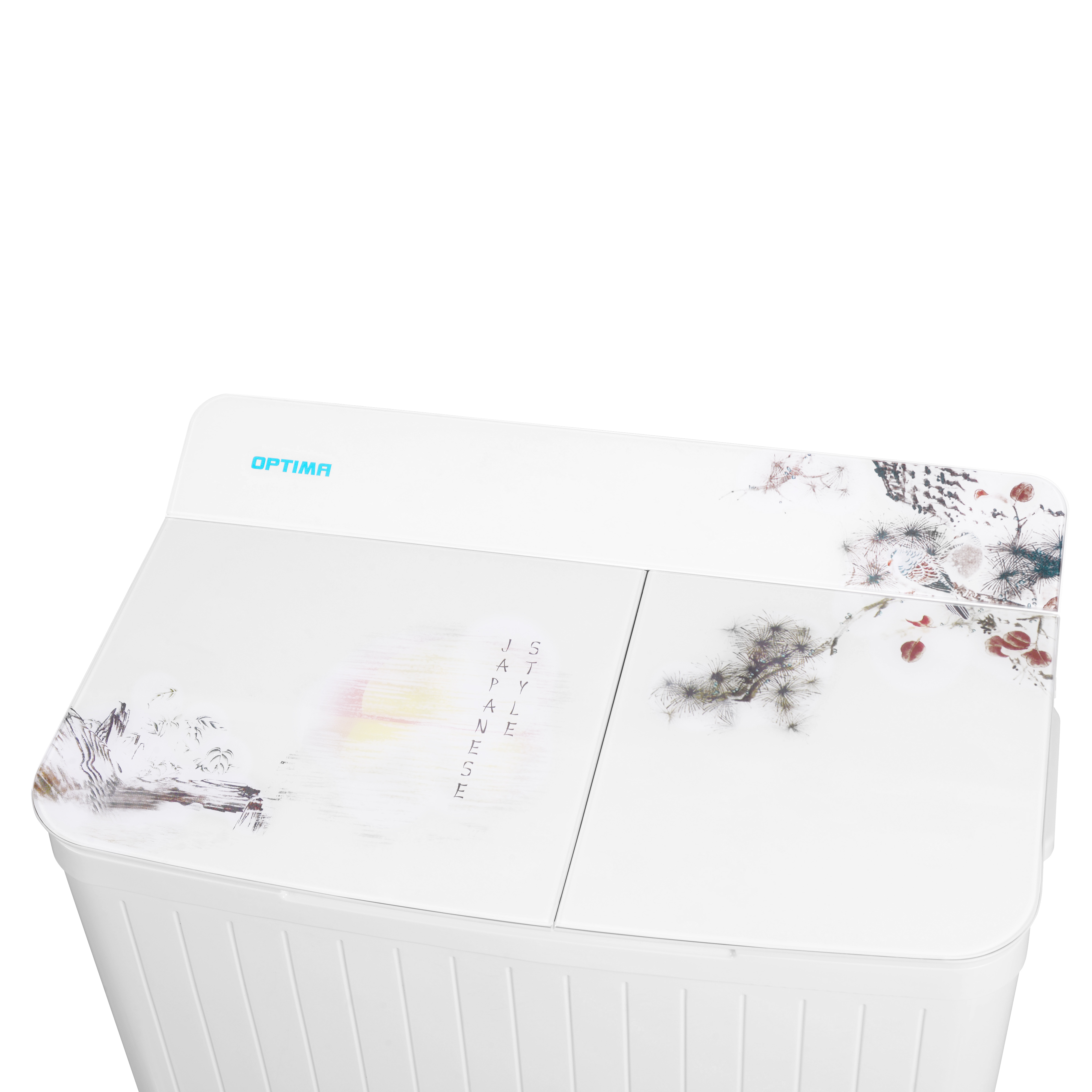 Стиральная машина OPTIMA МСП-66СТ полуавтомат, встроенный сливной насос, материал бака и центрифуги - пластик, стеклянная крышка с принтом, загрузка 6 кг/4кг, мощность стирки 480 Вт, отжим 1350 об/мин, фильтр от ворса